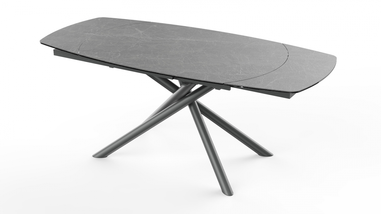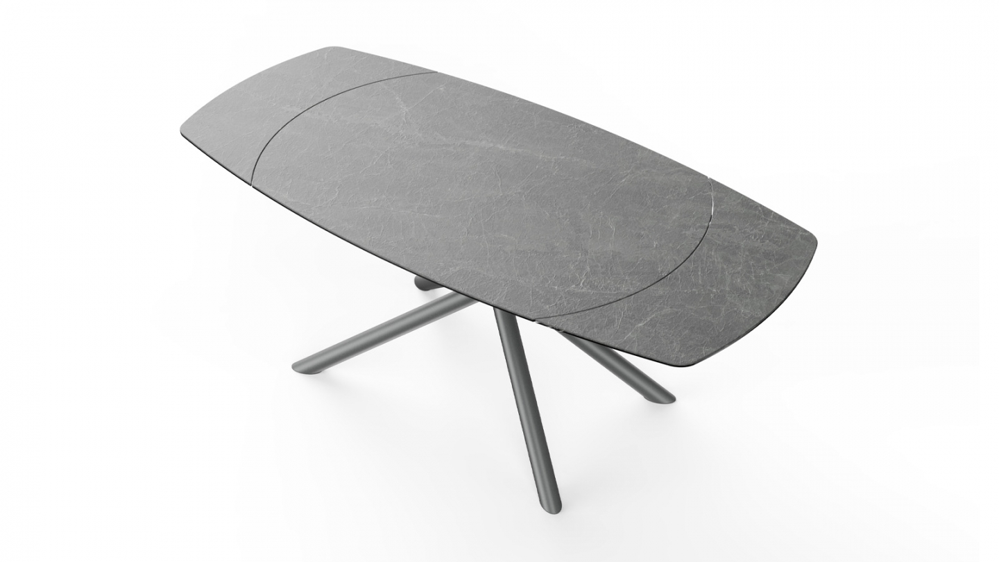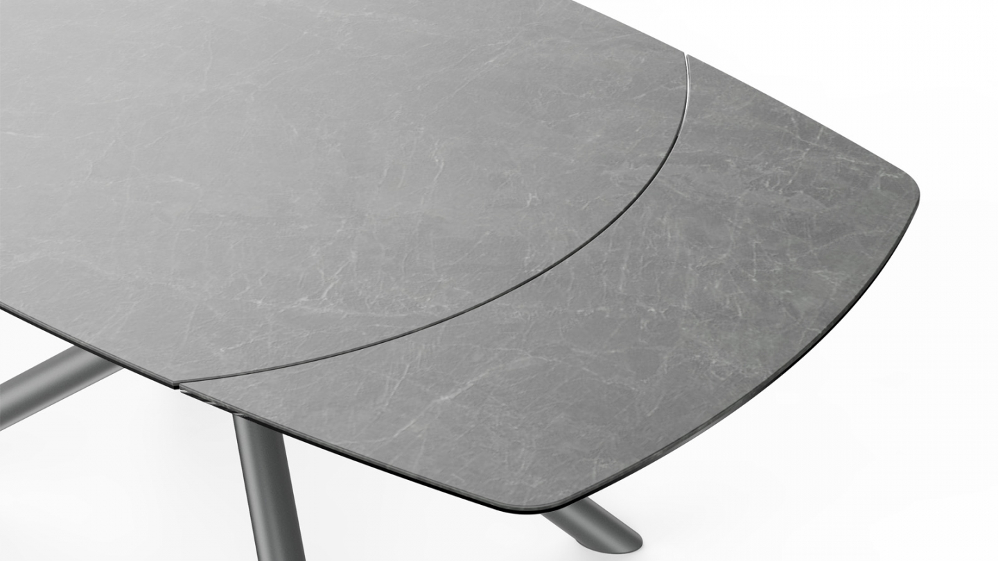 Compact et polyvalent, le format de la table Disko s'adapte aux petits comme aux grands espaces. Son plateau céramique gris anthracite aux extrémités arrondies s'étend de 130 à 190 cm grâce à ses 2 allonges sur rail.