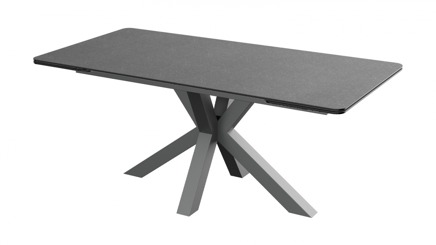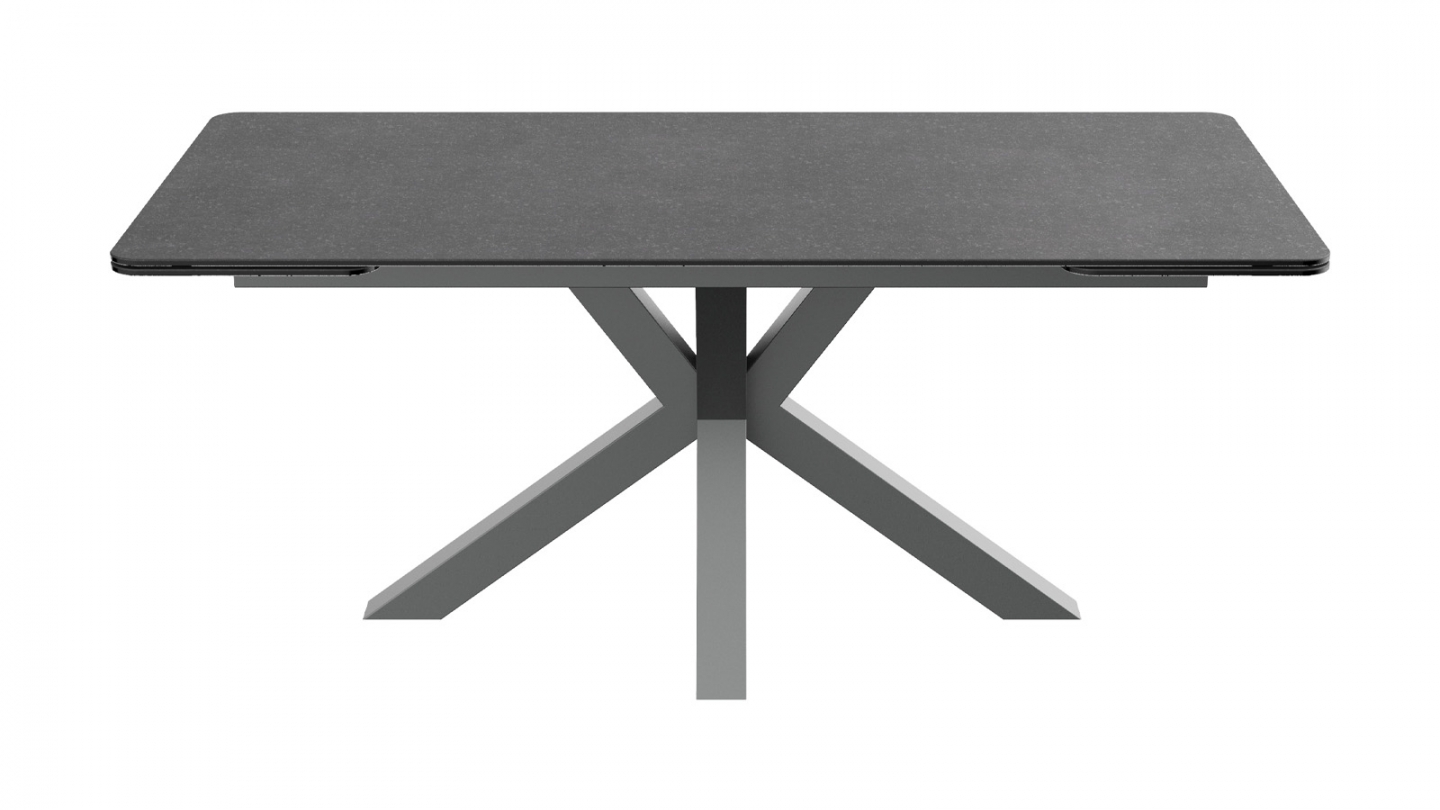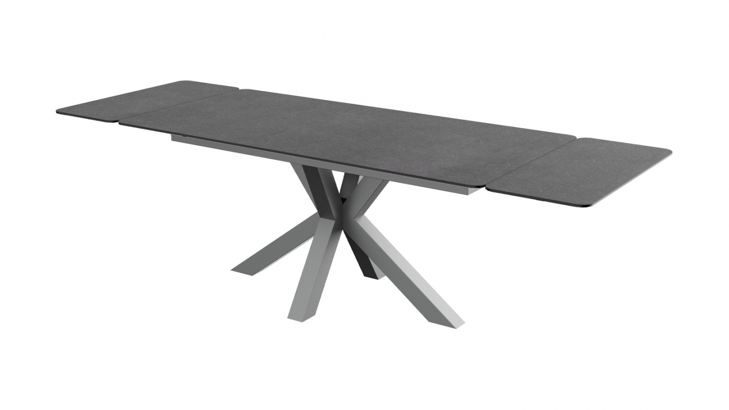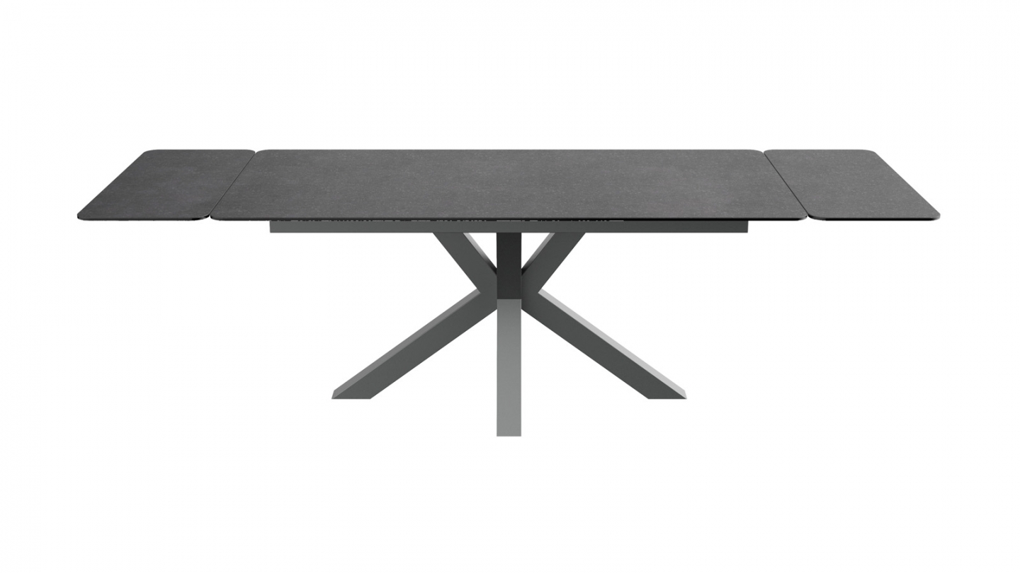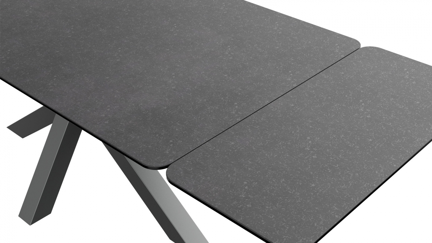 Grande table, grand style. La table Stromboli accueille jusqu'à 10 convives grâce à ses 2 allonges sur rail, avec un généreux plateau céramique gris anthracite à coins arrondis sur piètement étoile noir.