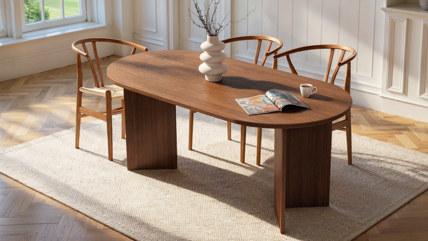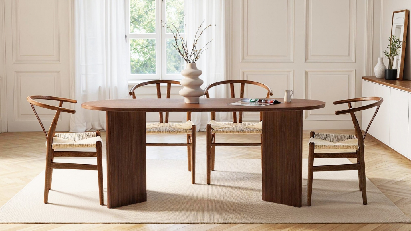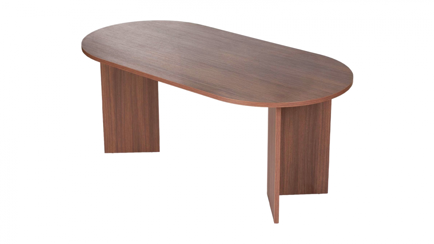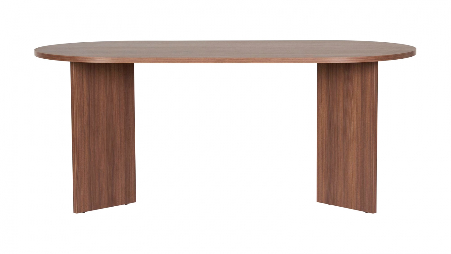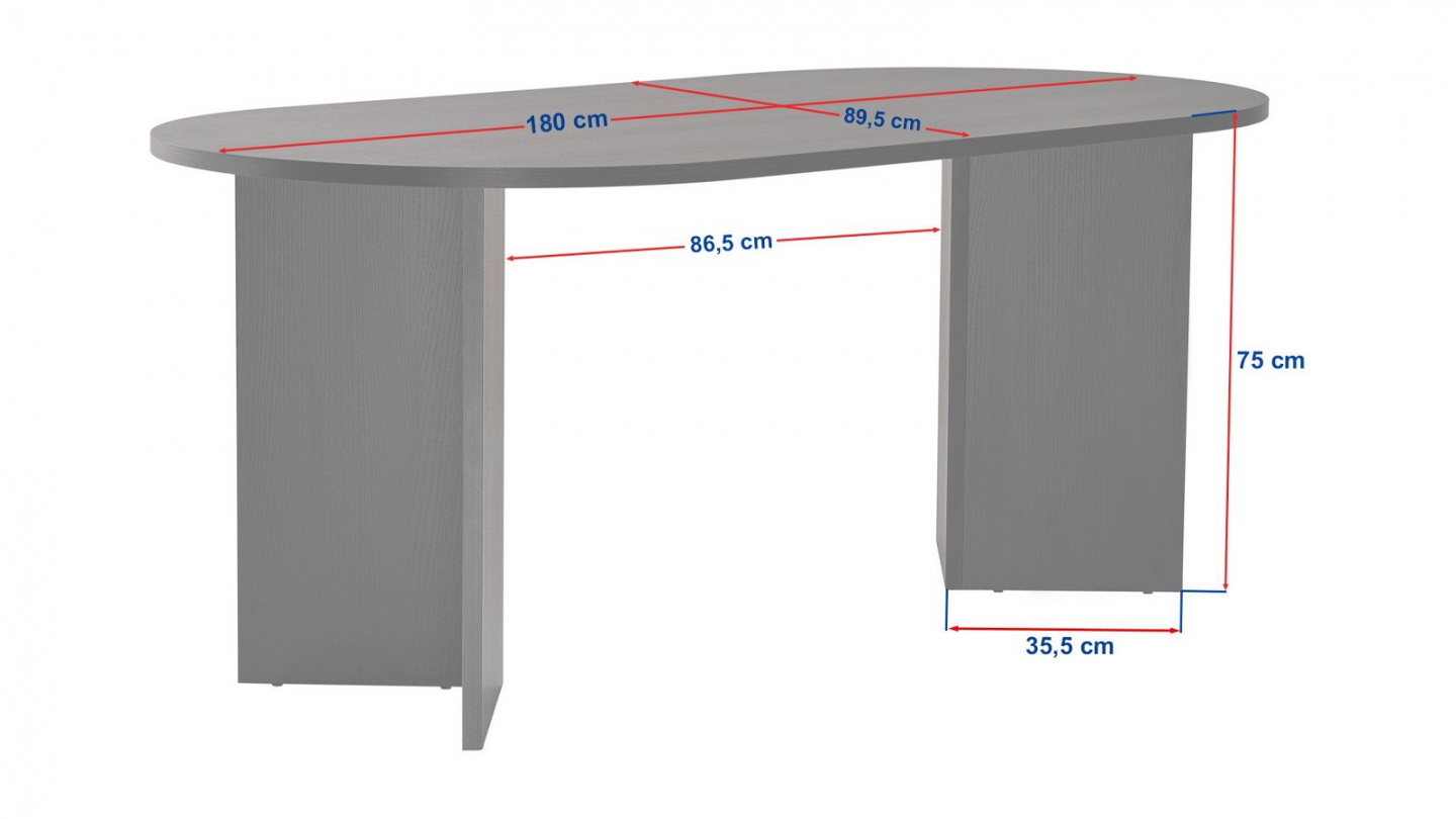 En stockTable à manger - Suna• Matière : Mélamine• Couleur : Blanc• Forme : ovale• Lignes douces et piètement en panneaux croisés pour un design épuré et lumineux.• Dimensions totales : 180 x 89.5 x 75 cm