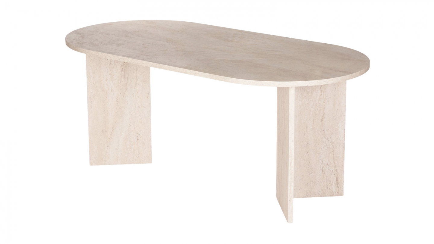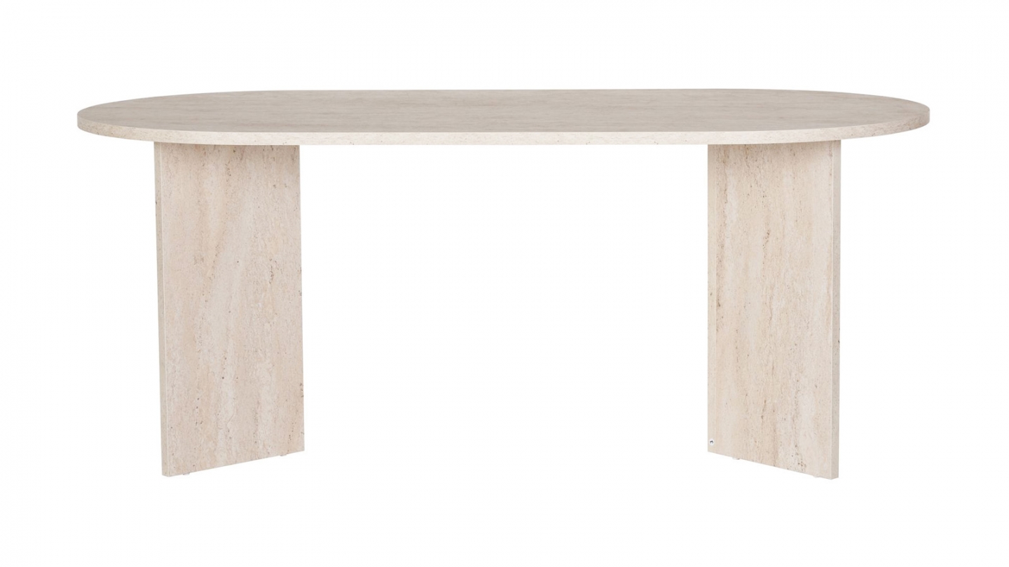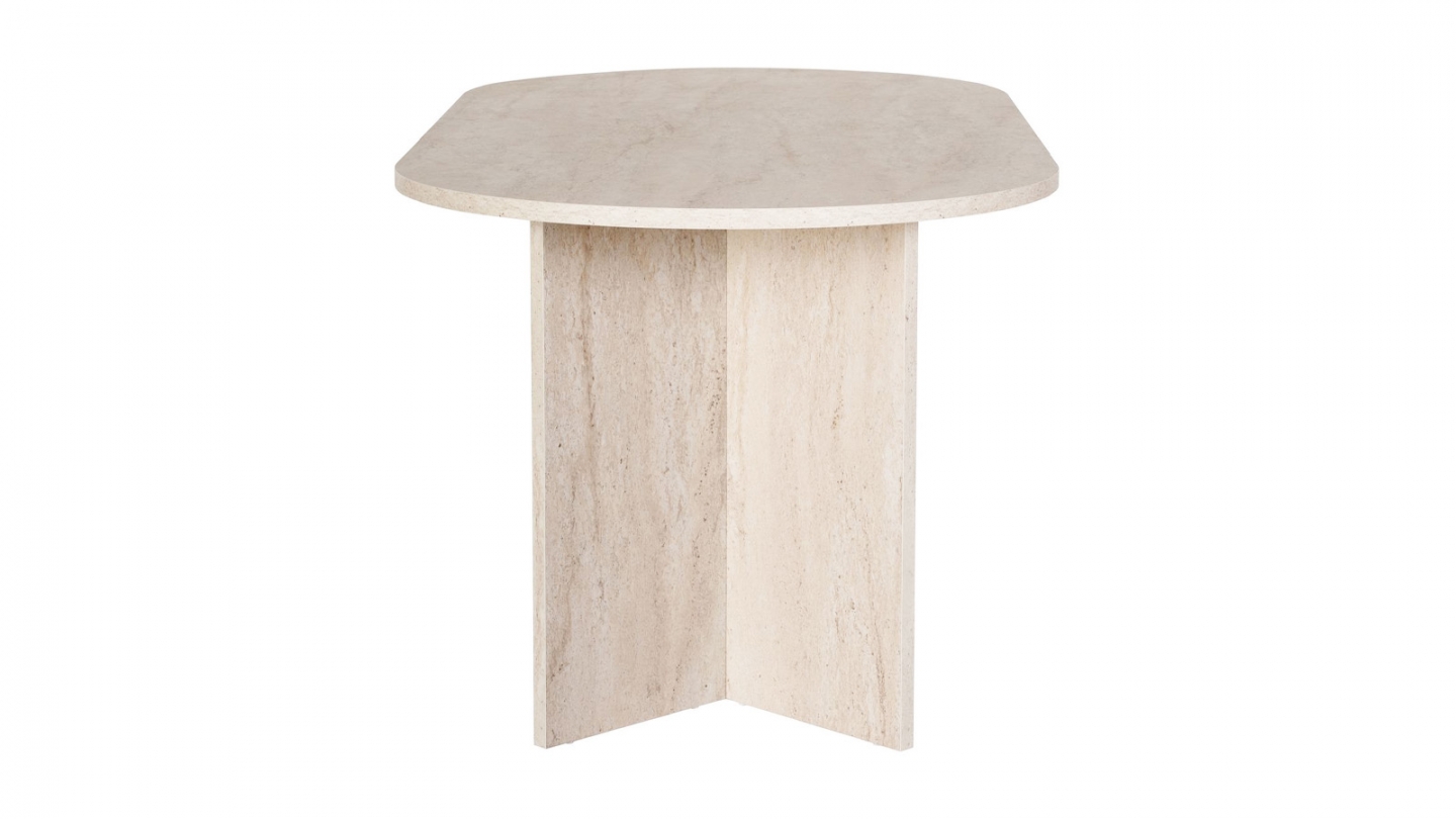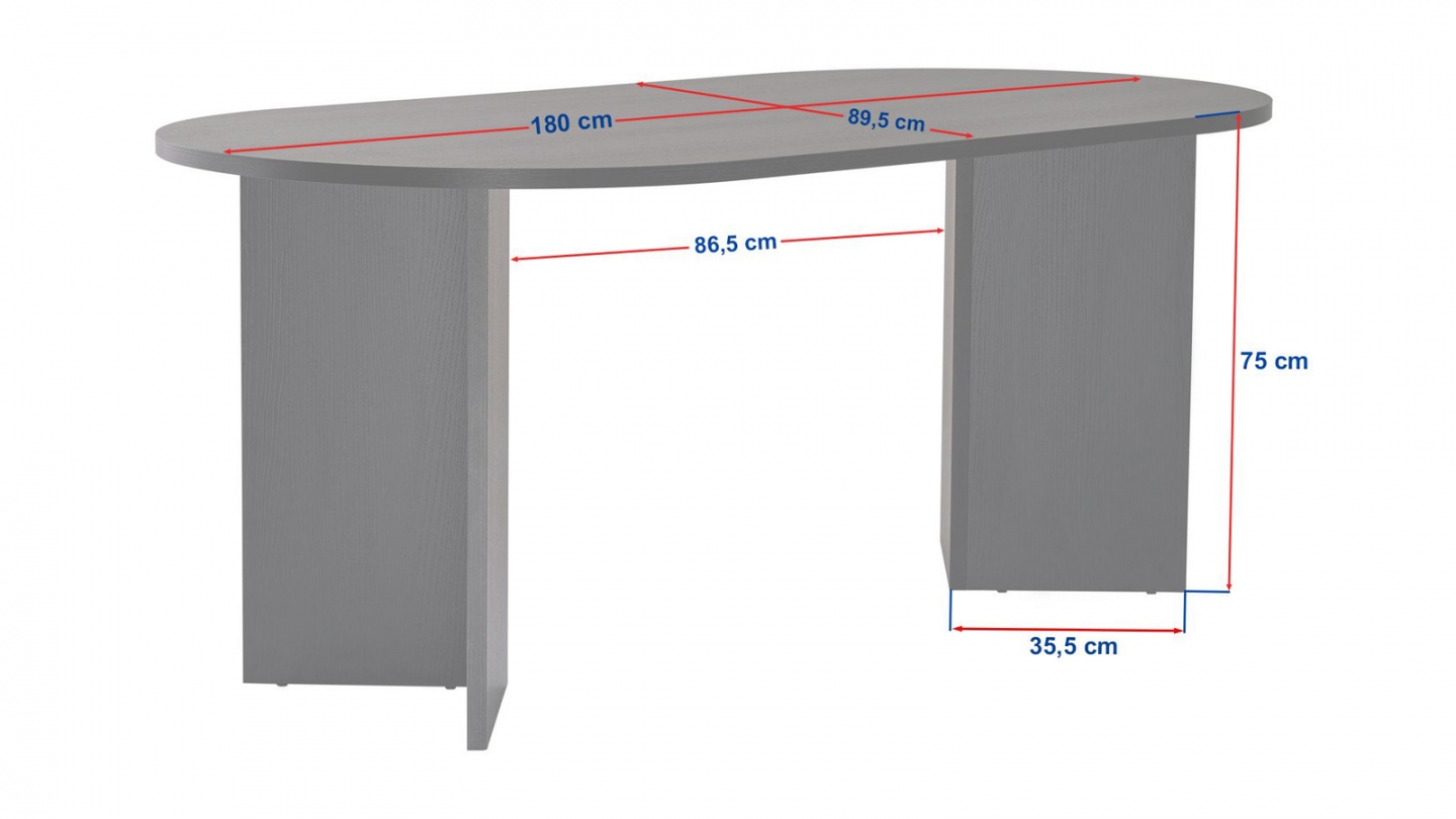 En stockTable à manger - Suna• Matière : Mélamine• Couleur : Blanc• Forme : ovale• Lignes douces et piètement en panneaux croisés pour un design épuré et lumineux.• Dimensions totales : 180 x 89.5 x 75 cm