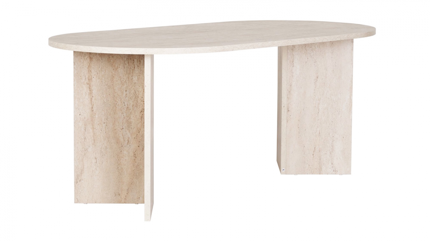 Rupture de stockTable à manger extensible - Marlon • Matière de la structure : MDF • Finition : Mélamine • Couleur : Plateau effet travertin - Piètement blanc • Piètement en MDF couleur blanc • Dimensions totales : 120/160 x 80 x 75 cm • Charge maximale : 60 kg • Conseils d'entretien : Nettoyer avec un chiffon humide sans produit • A monter soi-même