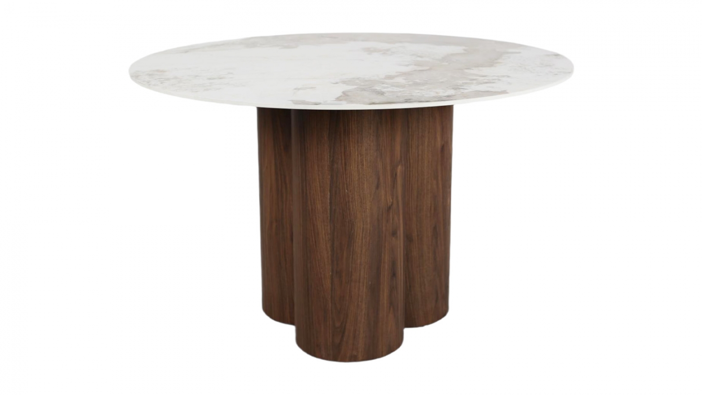 Rupture de stockTable à manger ronde couleur noyer avec plateau en céramique effet marbre- Mira • Couleur : noyer • Matière principales : Bois • Nombre de places : 5 à 6 personnes • Forme : ronde • Plateau en céramique mat effet marbre • Matière du piètement : en bois effet cannelé - Hauteur 70 cm Dimensions totales : 120 x 120 x 76 cm • Temps de montage : 15 min