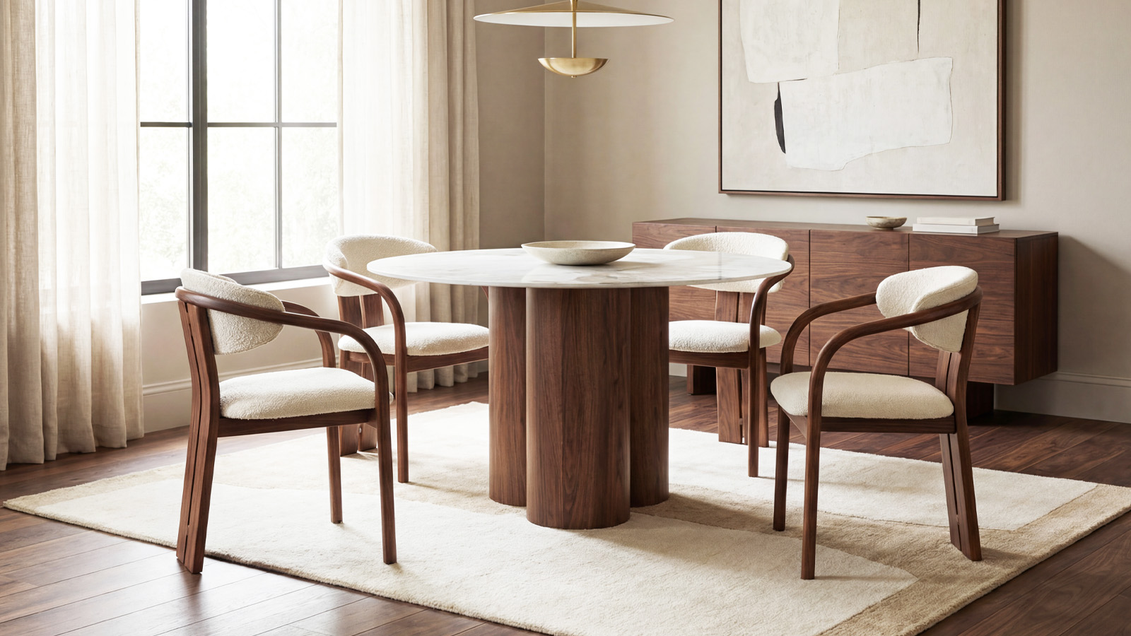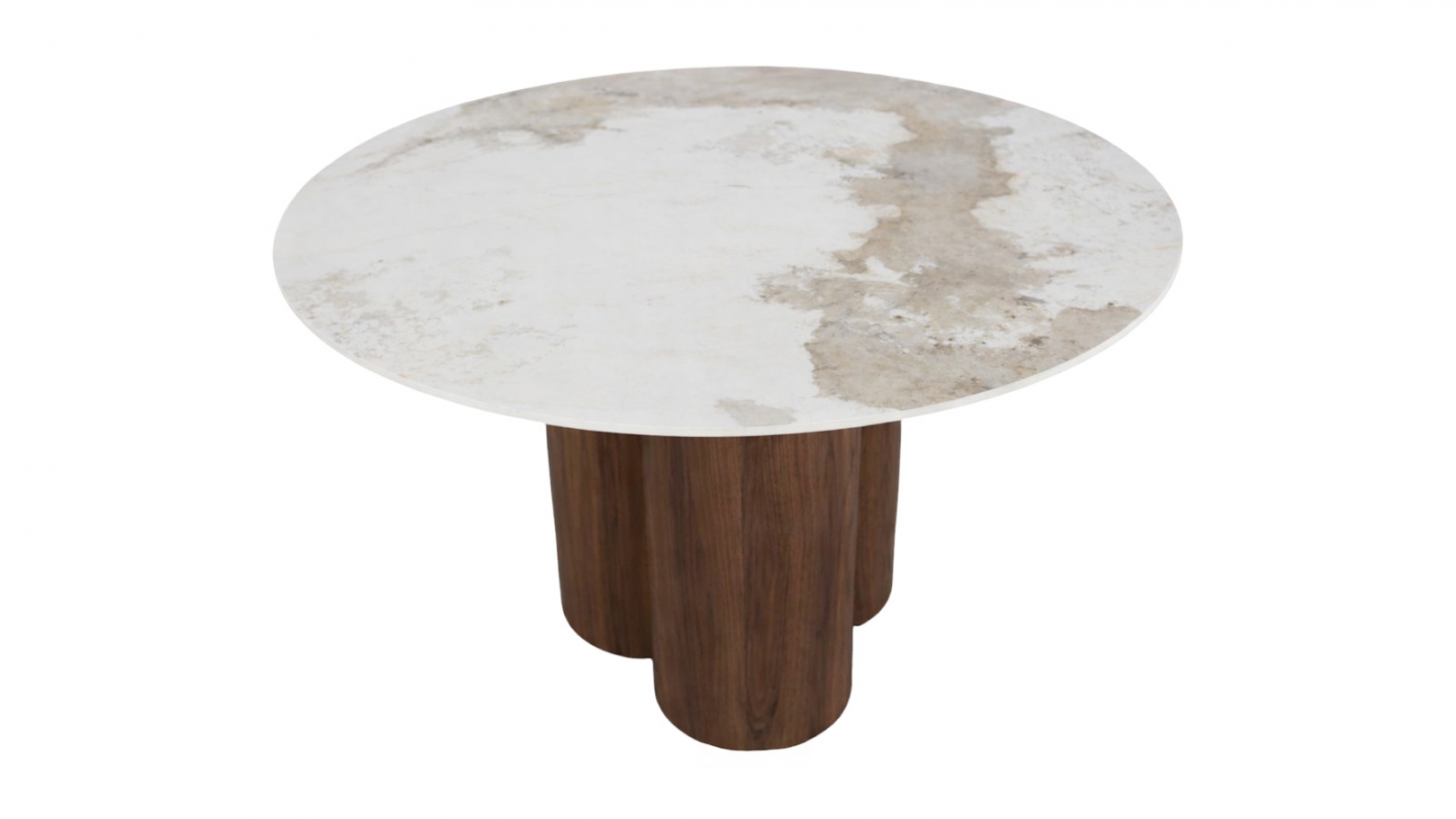 La convivialité à la française, réinterprétée avec élégance. La table Brescia réunit un plateau rond en céramique effet marbre Pandora et un piètement central en colonnettes cylindriques assemblées finition noyer, pour une atmosphère chaleureuse et sophistiquée.