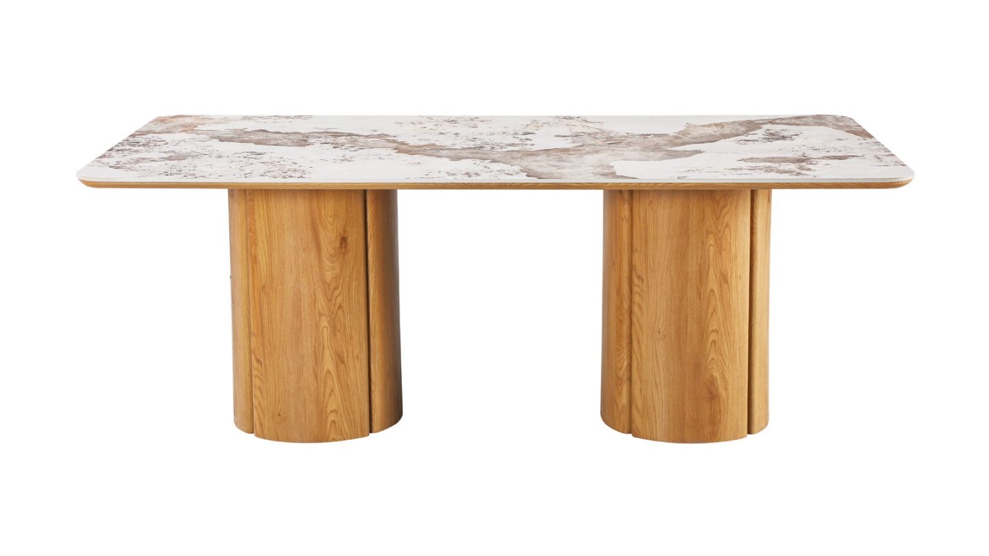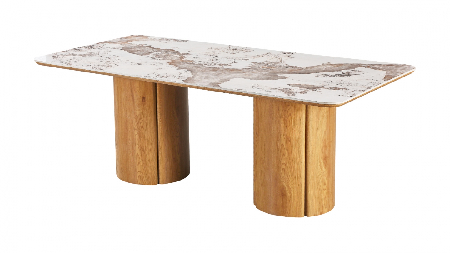 Noblesse des matières, générosité des proportions. La table Sybille associe un épais plateau céramique effet marbre Pandora à un piètement architecturé en bois lobé finition chêne clair.