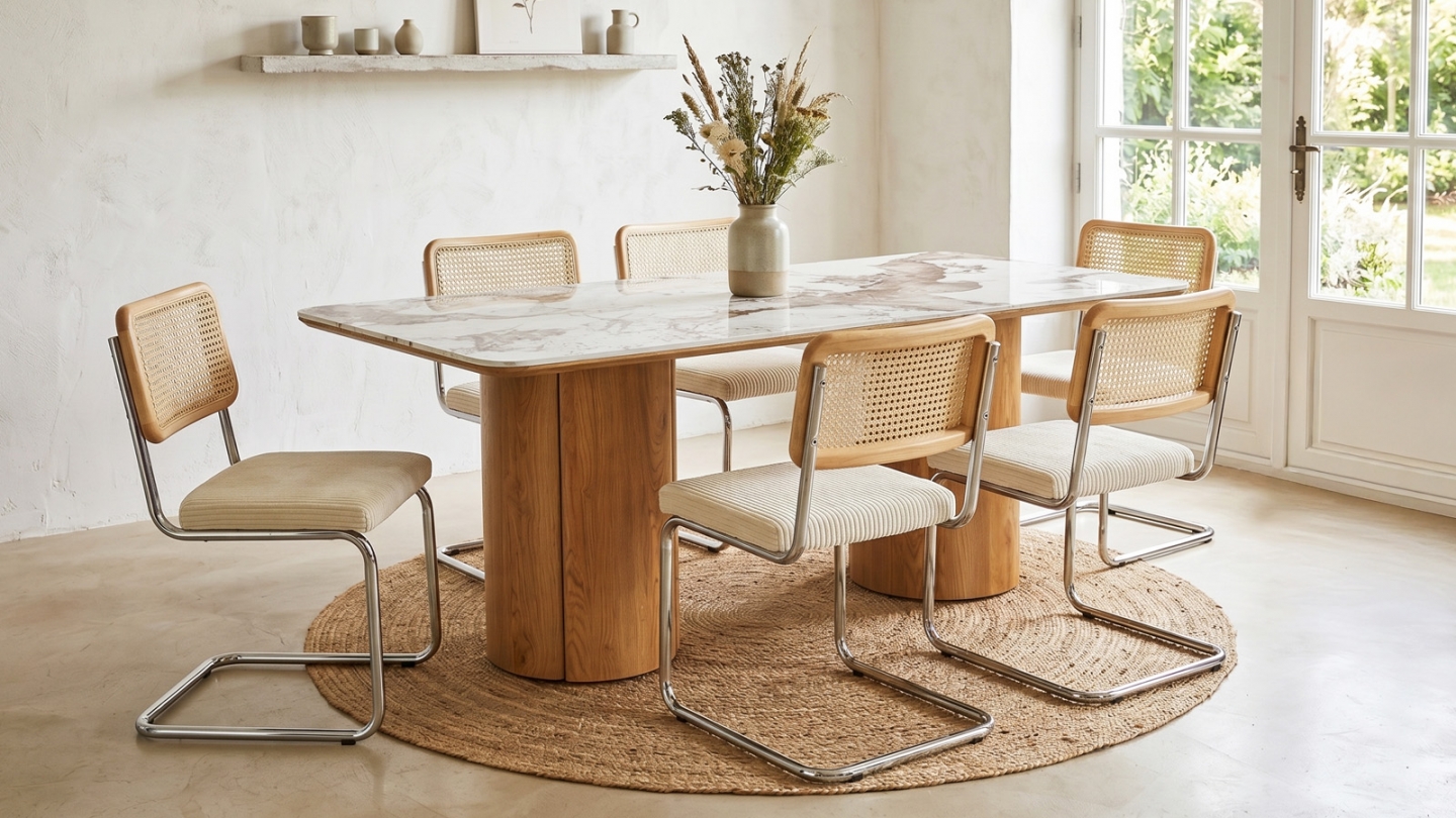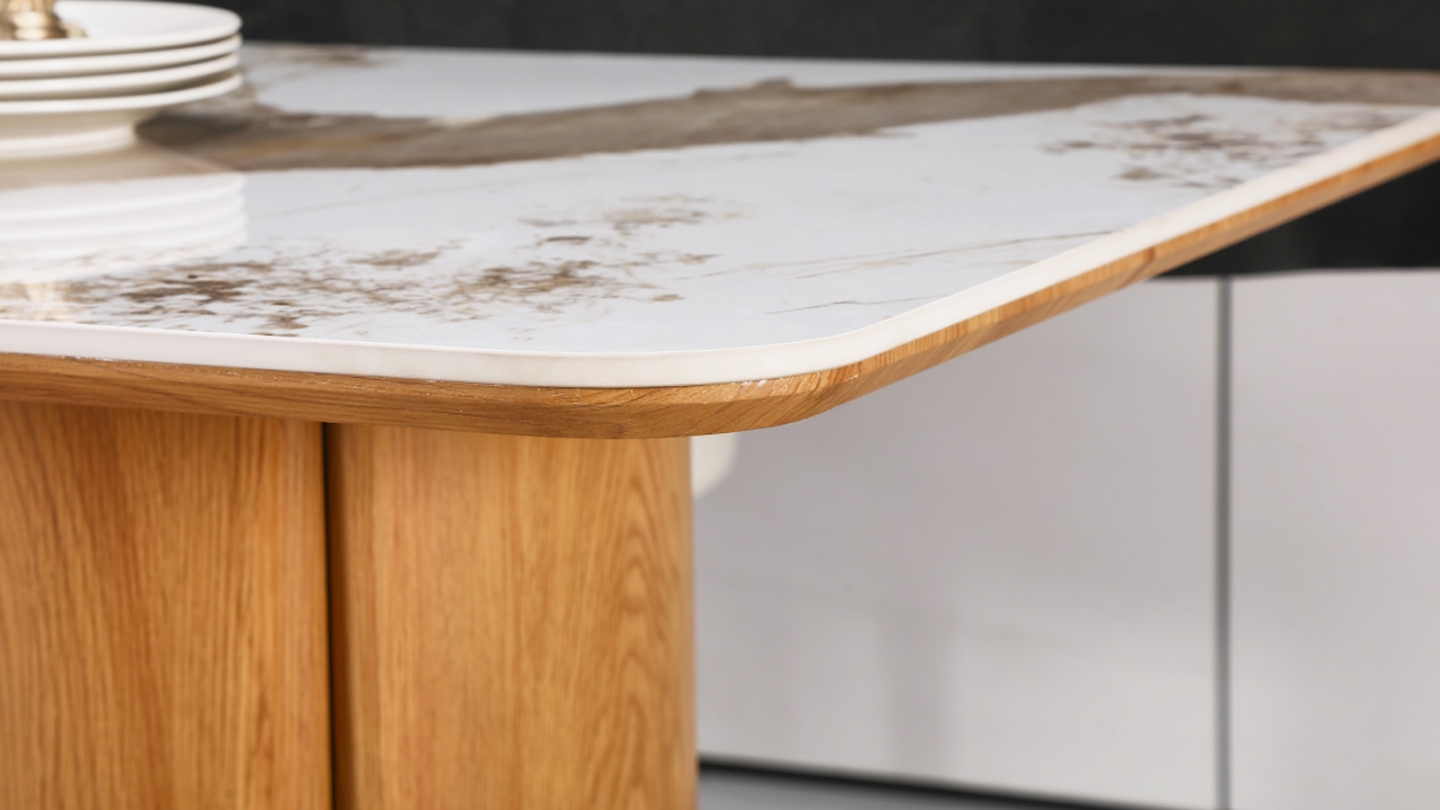 La céramique est l'un des matériaux les plus exigeants utilisés en ameublement. Contrairement au verre ou au bois, elle résiste naturellement aux rayures des couverts, à la chaleur des plats sortis du four et aux taches du quotidien. Avec ses 11 mm d'épaisseur collés sur une âme bois de 18 mm, le plateau de la Sybille offre un rendu premium et une solidité supérieure aux céramiques fines — un simple coup d'éponge suffit pour retrouver sa surface immaculée.