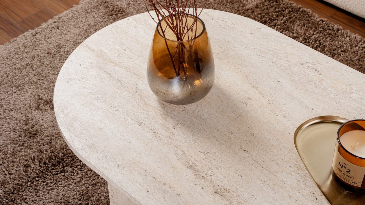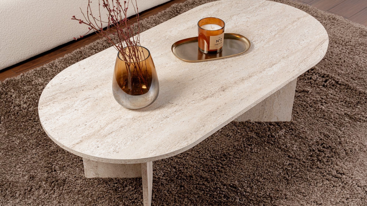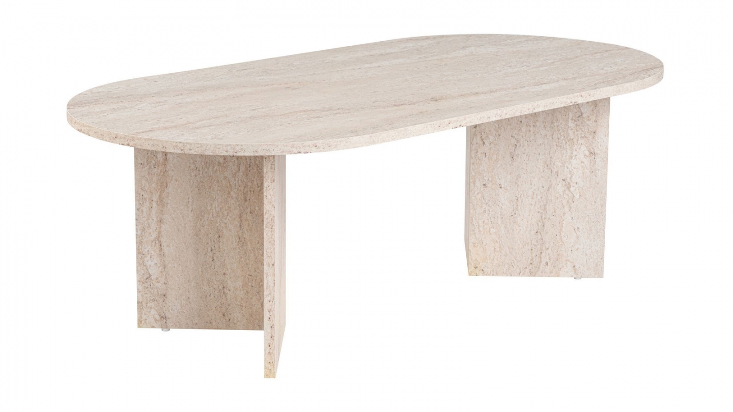 En stockTable basse - Orane• Matière : Mélamine• Couleur : Effet bois• Forme : ovale• Piètement en panneaux croisés assurant une parfaite stabilité et un style graphique moderne.• Dimensions totales : 119 x 60 x 40 cm