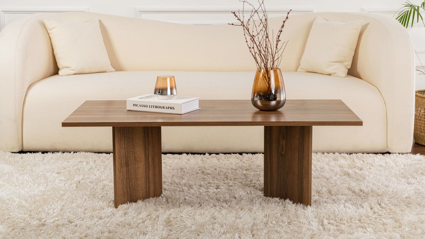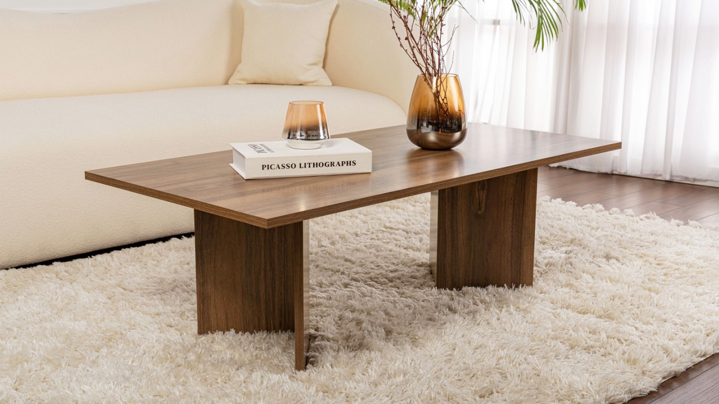 En stockTable basse - Taona• Matière : Mélamine• Couleur : Effet Noyer• Forme : rectangulaire• Piètement en panneaux croisés pour une silhouette épurée et contemporaine• Dimensions totales : 119 x 60 x 40 cm