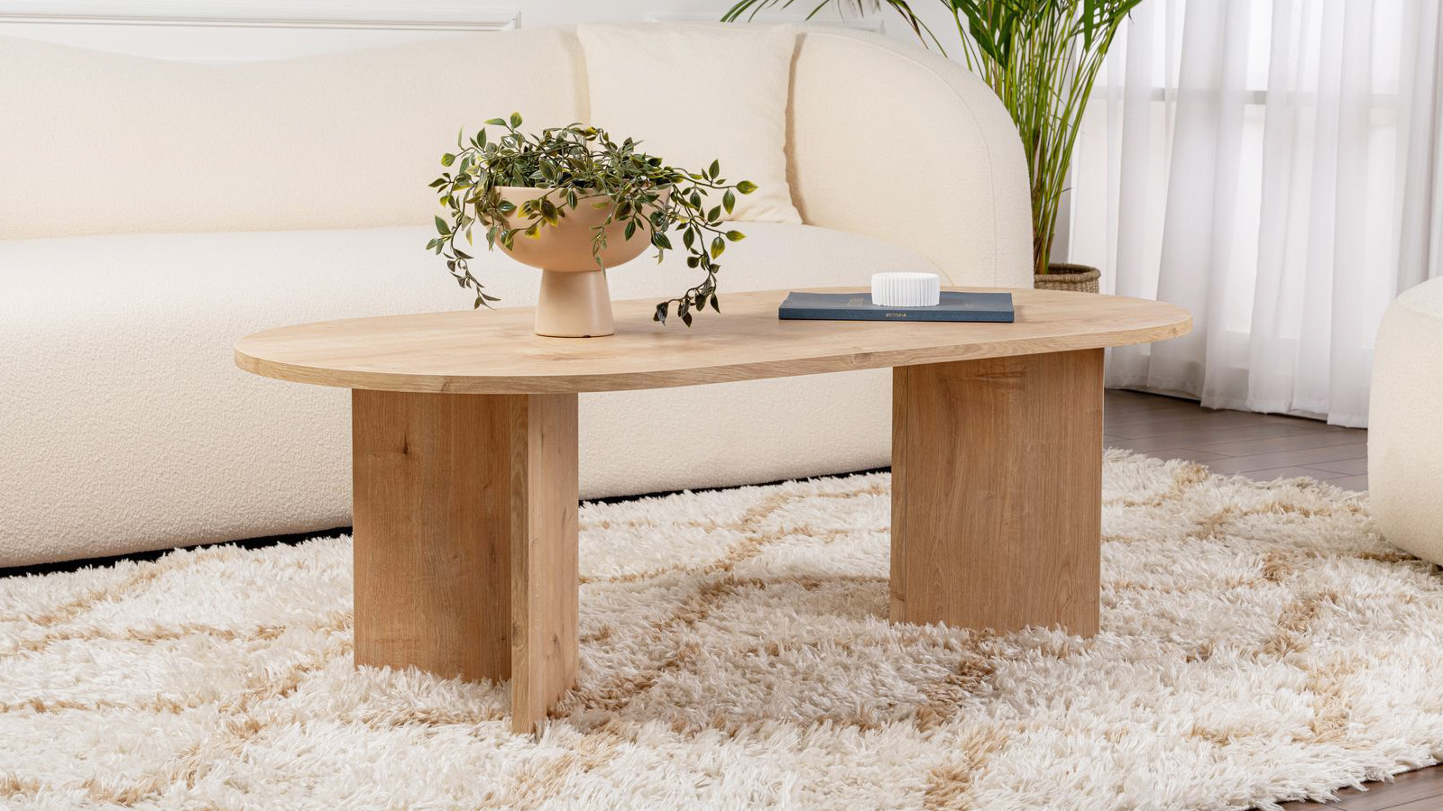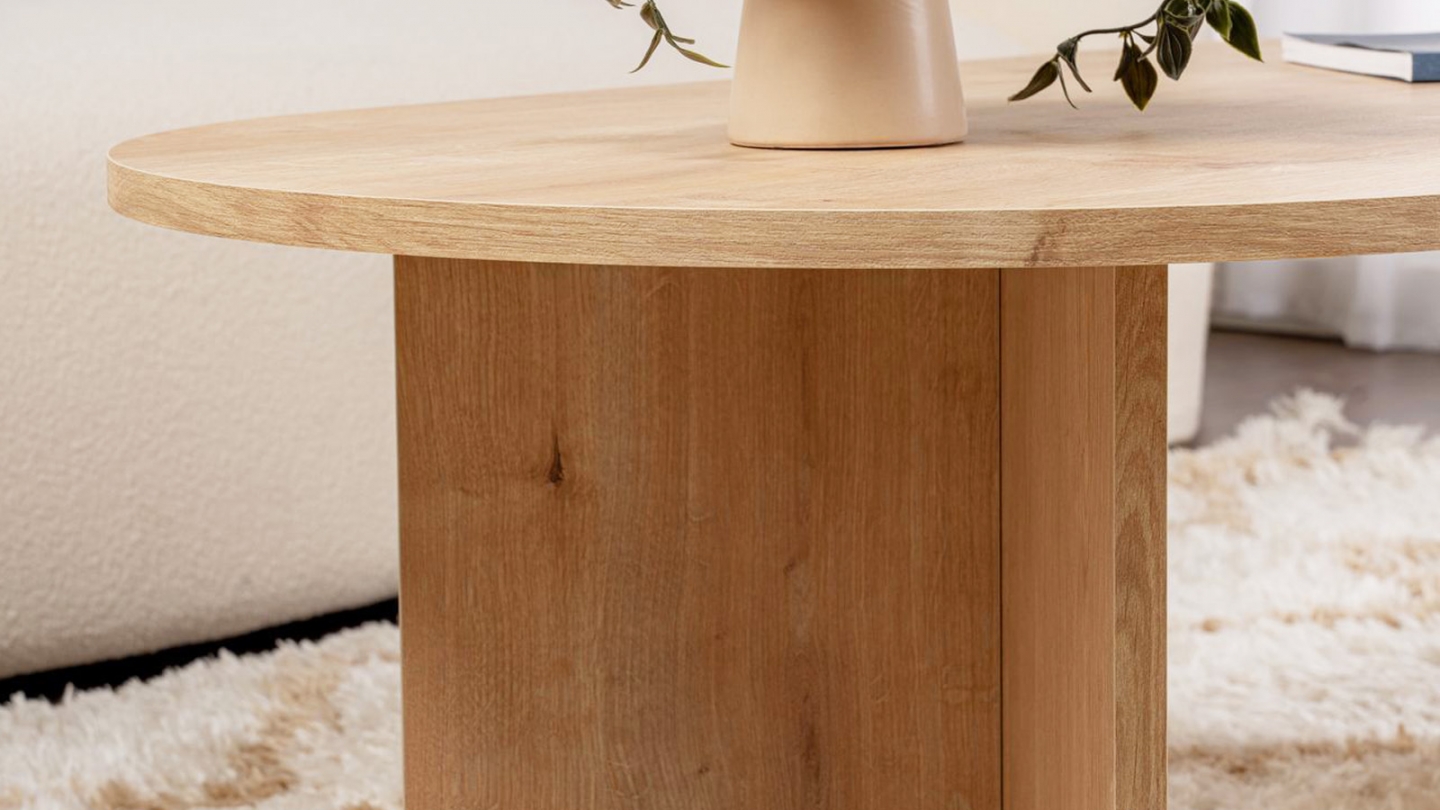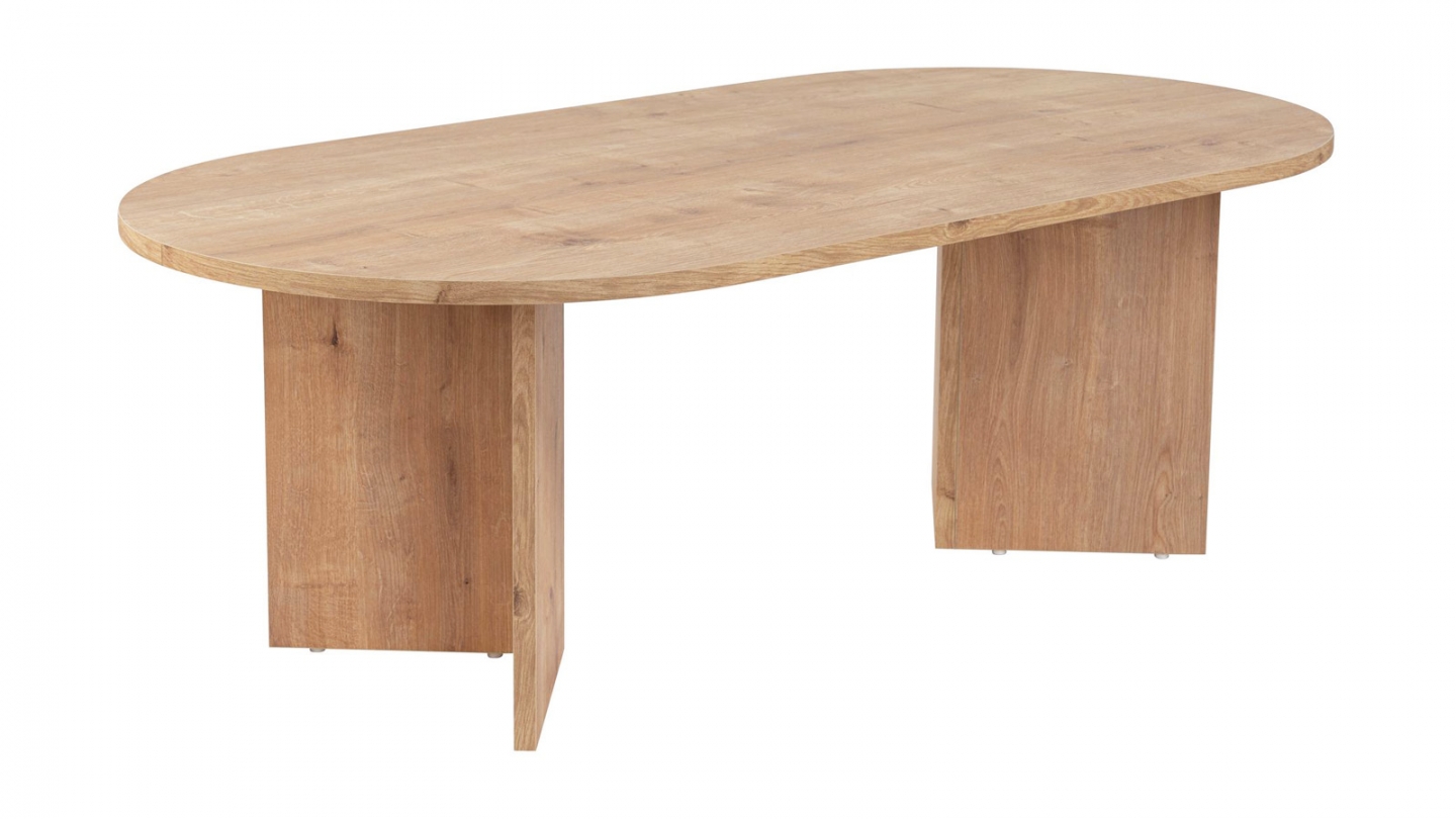 En stockTable basse - Orane• Matière : Mélamine• Couleur : Effet bois• Forme : ovale• Piètement en panneaux croisés assurant une parfaite stabilité et un style graphique moderne.• Dimensions totales : 119 x 60 x 40 cm