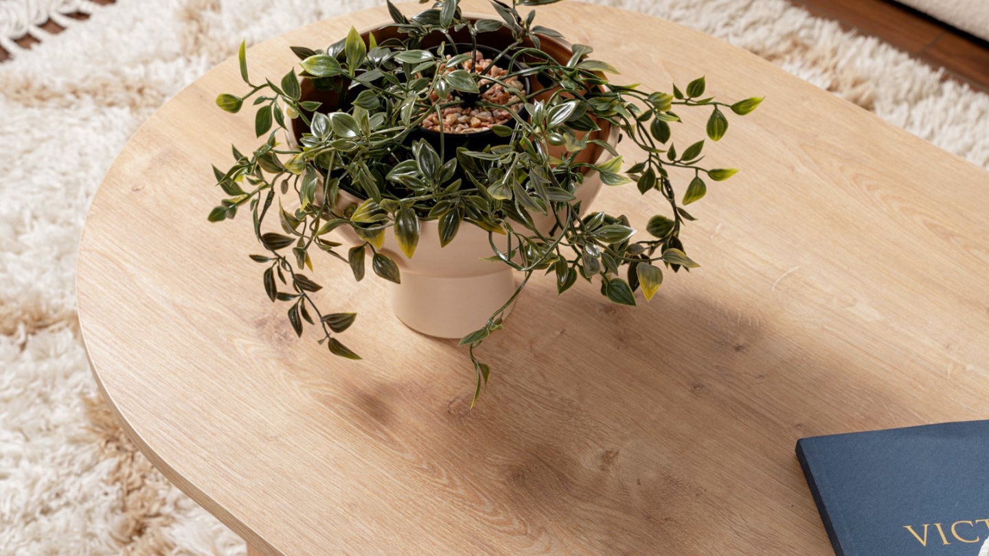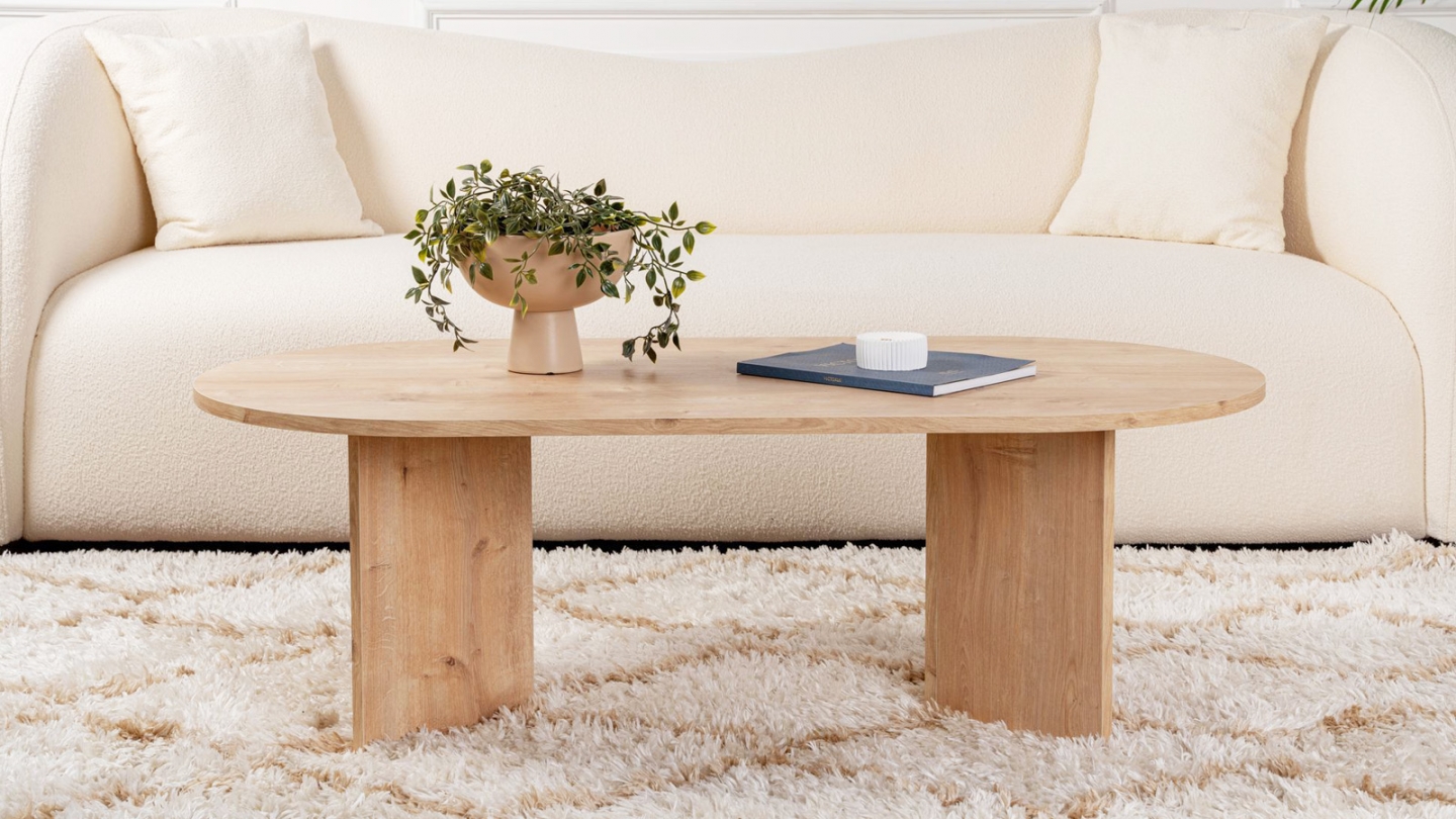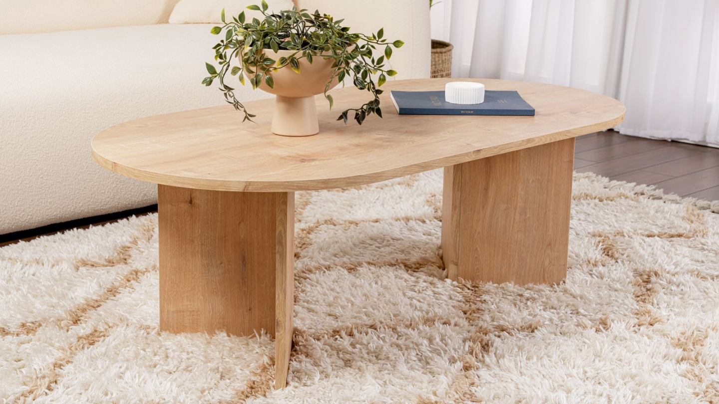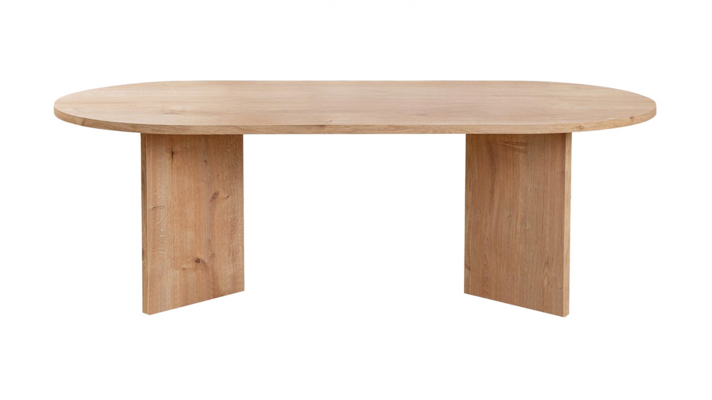 En stockTable basse - Orane• Matière : Mélamine• Couleur : Effet bois• Forme : ovale• Piètement en panneaux croisés assurant une parfaite stabilité et un style graphique moderne.• Dimensions totales : 119 x 60 x 40 cm
