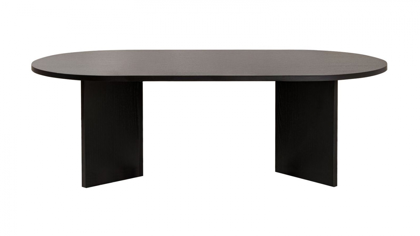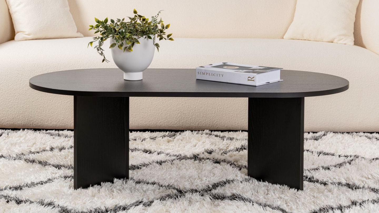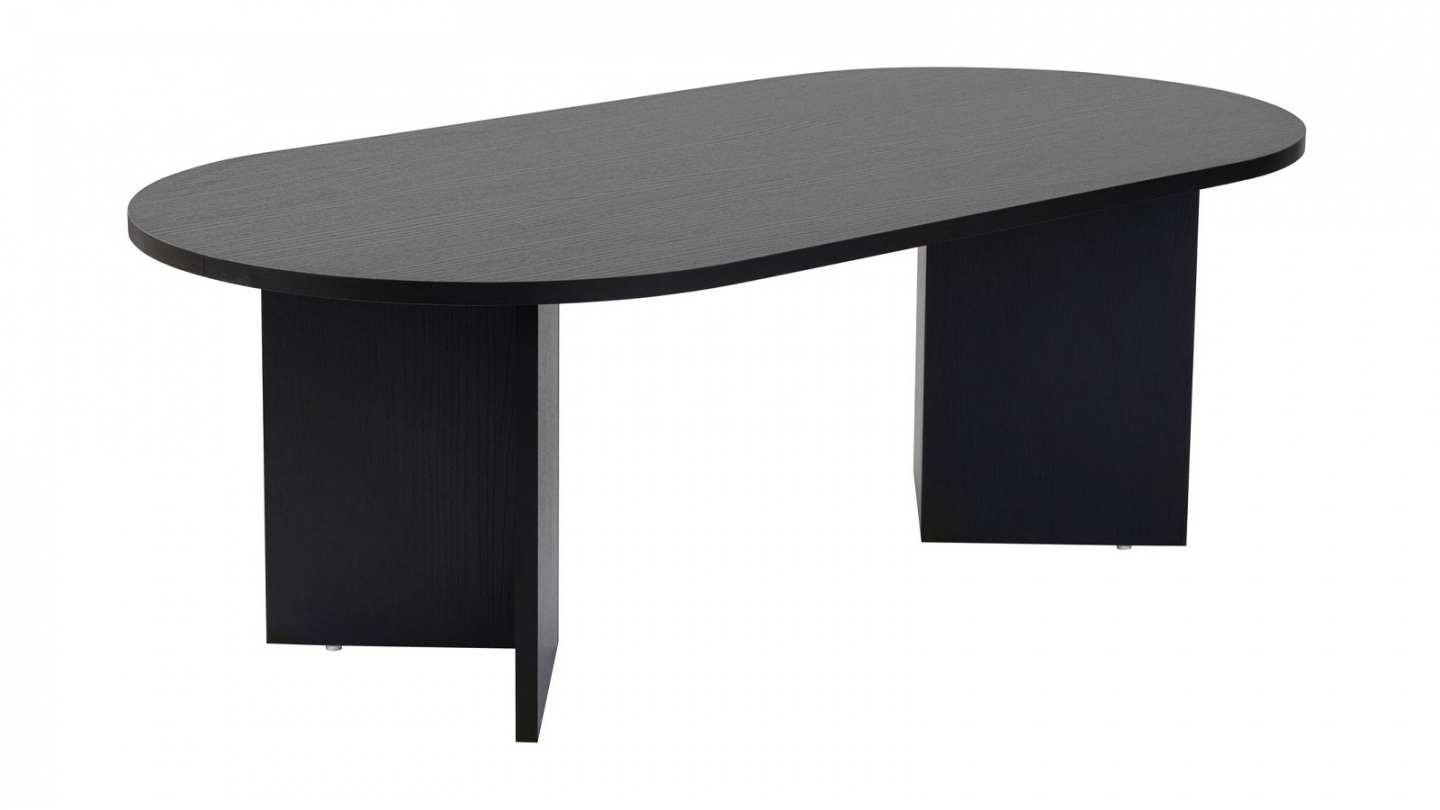 En stockTable basse - Orane• Matière : Mélamine• Couleur : Effet bois• Forme : ovale• Piètement en panneaux croisés assurant une parfaite stabilité et un style graphique moderne.• Dimensions totales : 119 x 60 x 40 cm