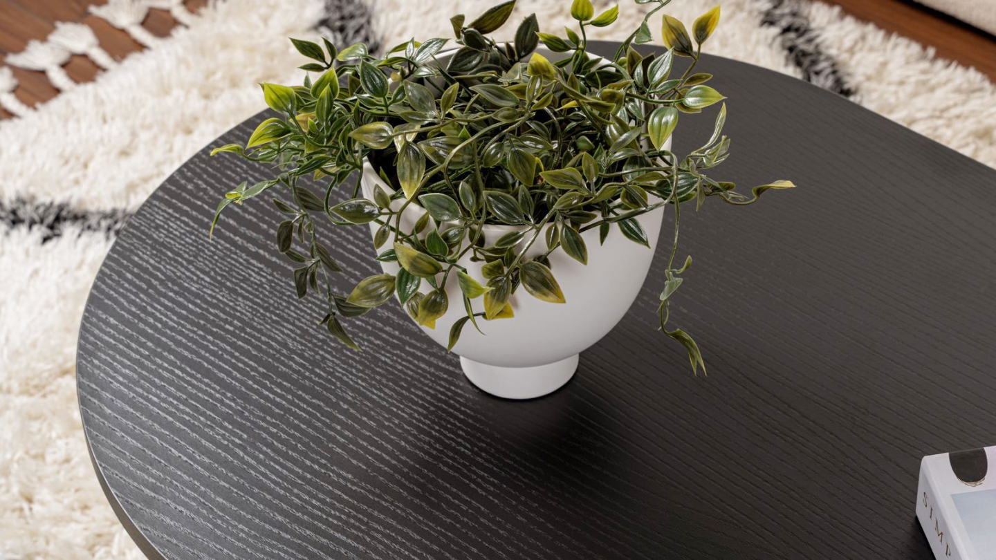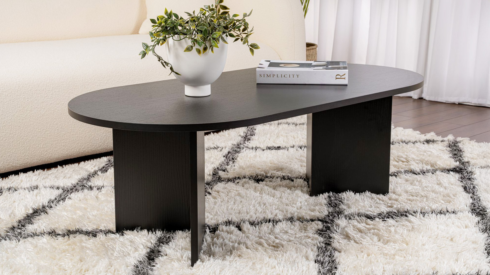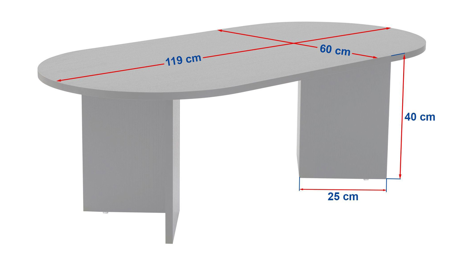 En stockTable basse - Orane• Matière : Mélamine• Couleur : Effet bois• Forme : ovale• Piètement en panneaux croisés assurant une parfaite stabilité et un style graphique moderne.• Dimensions totales : 119 x 60 x 40 cm