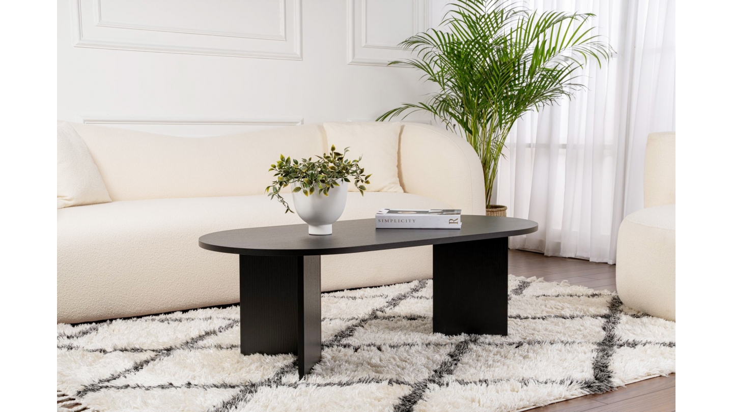 En stockTable basse - Orane• Matière : Mélamine• Couleur : Blanc• Forme : ovale• Piètement en panneaux croisés assurant une parfaite stabilité et un style graphique moderne.• Dimensions totales : 119 x 60 x 40 cm