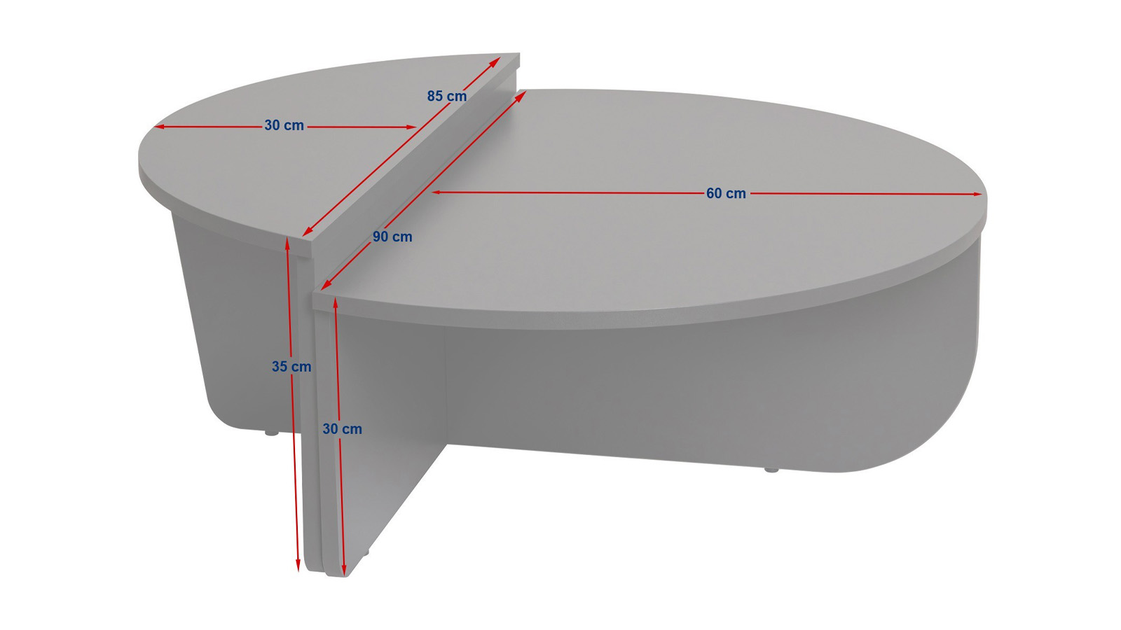 Table basse modulable - Selma• Matière : Mélamine• Couleur : Effet Noyer• Forme : ronde• Table basse modulable composée de deux éléments semi-circulaires, à utiliser ensemble ou séparément selon vos envies.• Dimensions totales : Partie 1 : 60 x 90 x 30 cm - Partie 2 : 30 x 85 x 35 cm