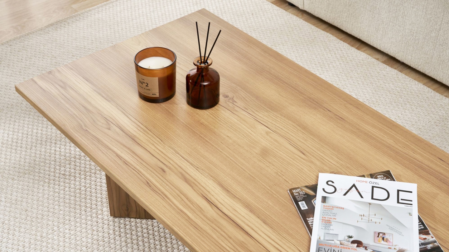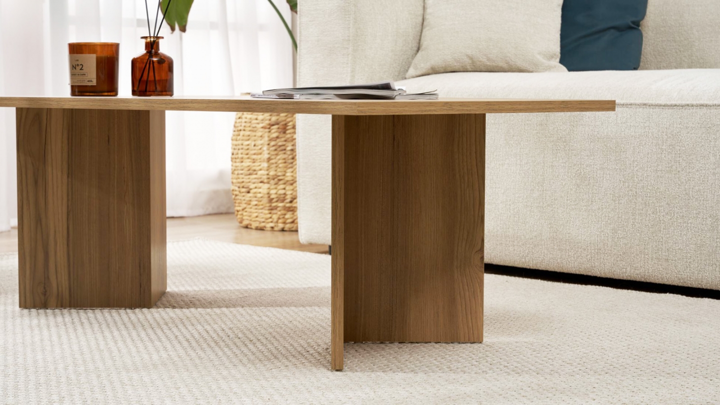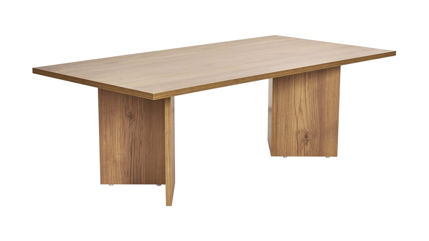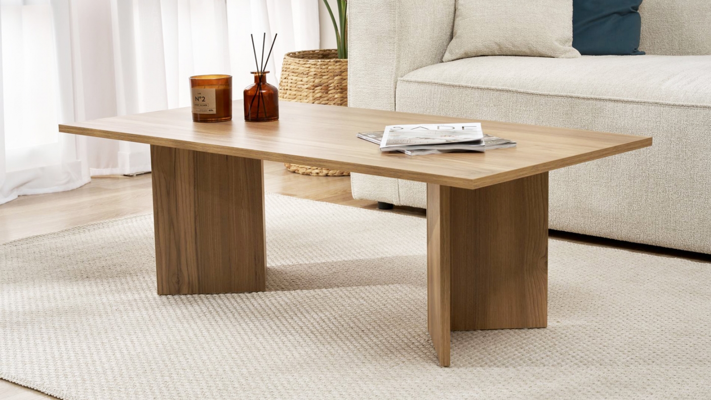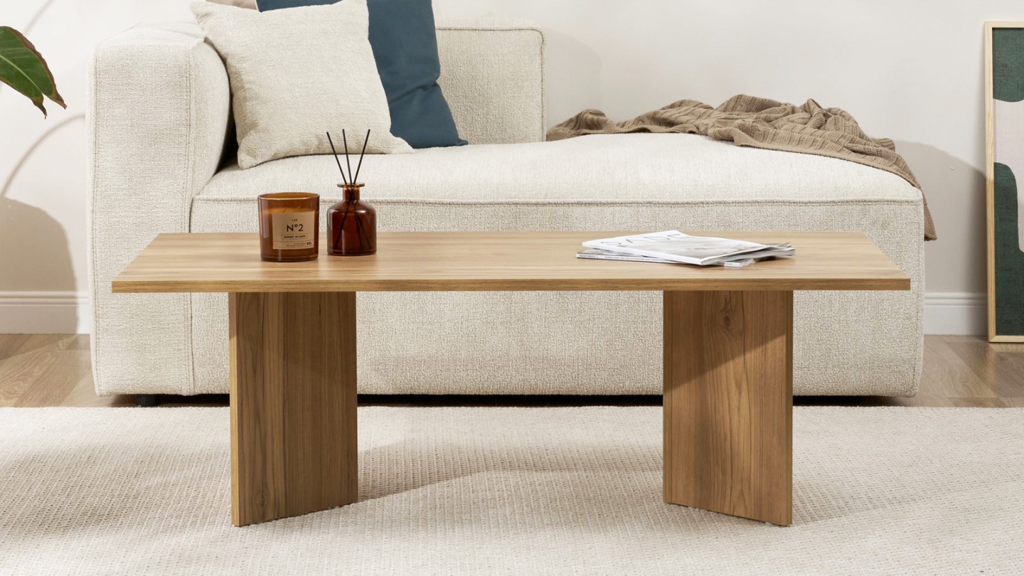 En stockTable basse - Taona• Matière : Mélamine• Couleur : Effet bois• Forme : rectangulaire• Piètement en panneaux croisés pour une silhouette épurée et contemporaine• Dimensions totales : 119 x 60 x 40 cm