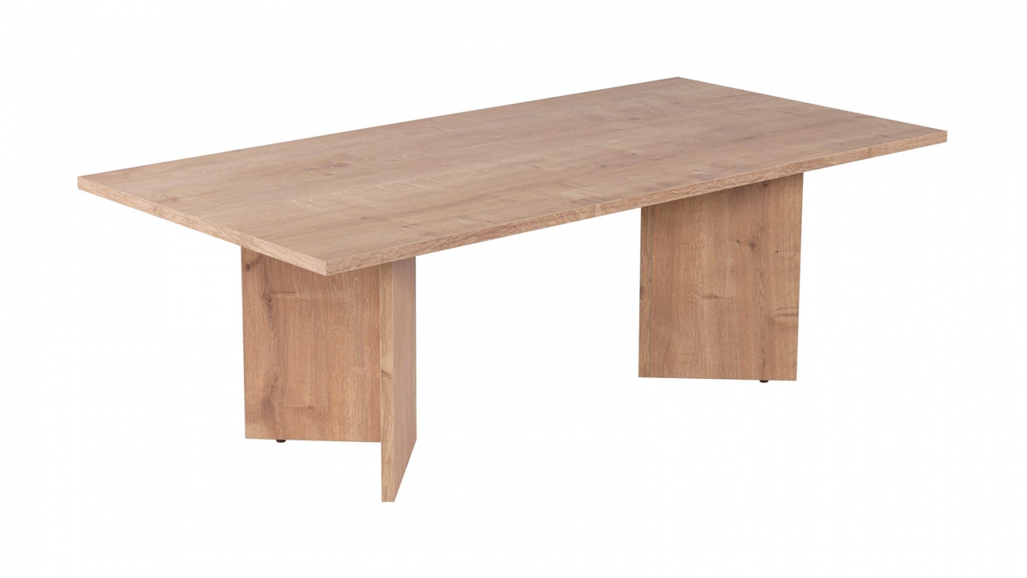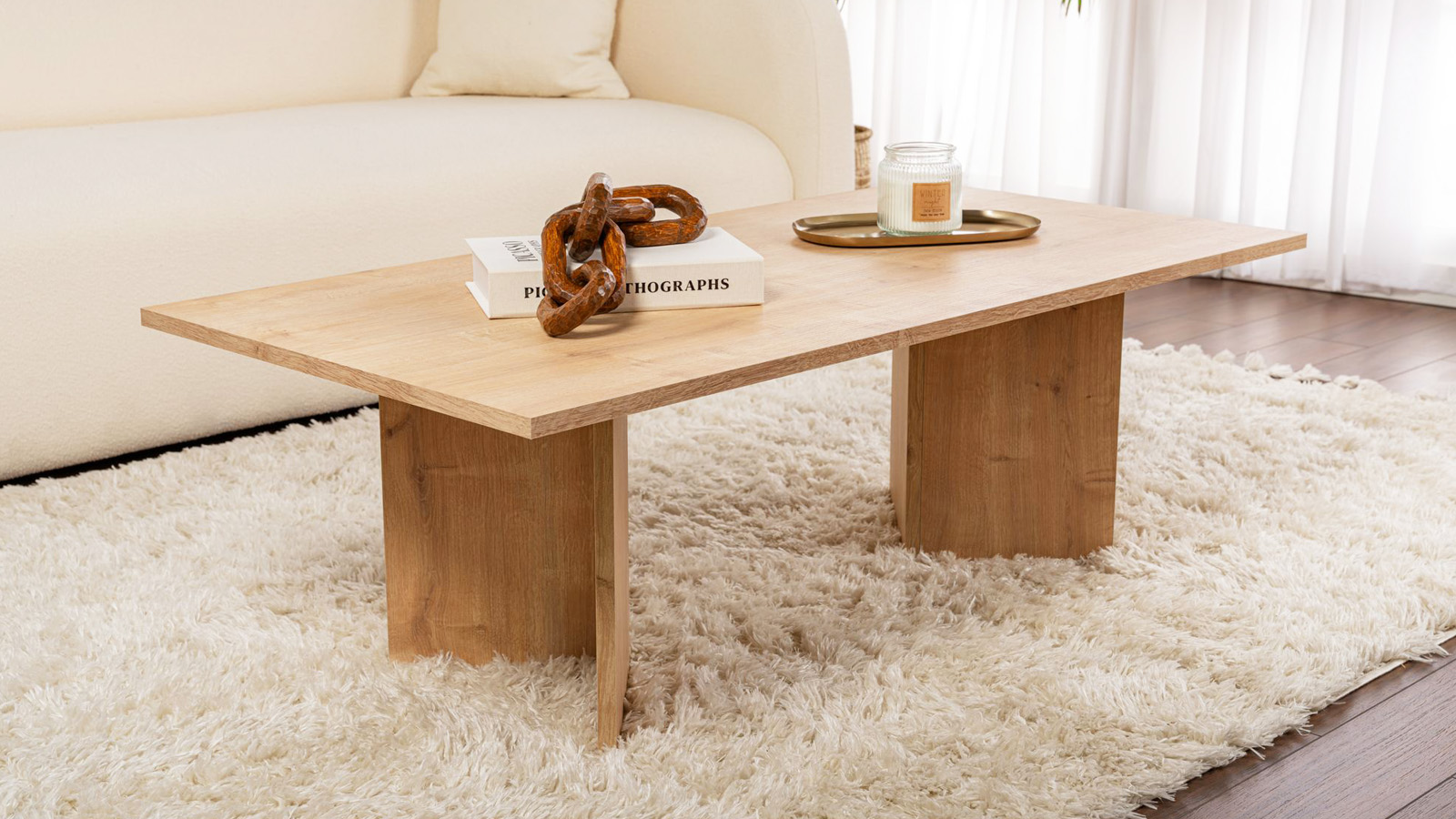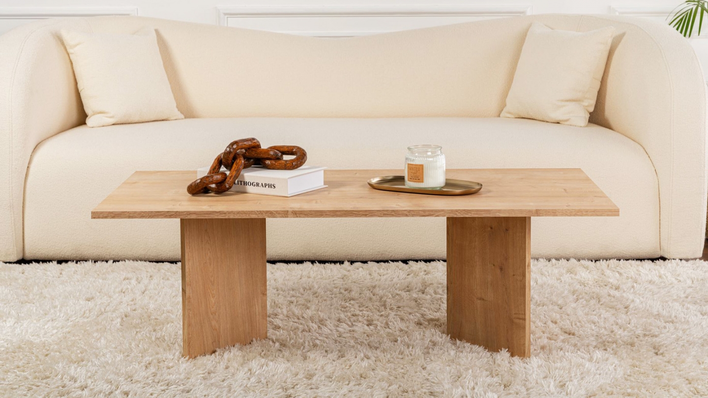 En stockTable basse - Taona• Matière : Mélamine• Couleur : Effet bois• Forme : rectangulaire• Piètement en panneaux croisés pour une silhouette épurée et contemporaine• Dimensions totales : 119 x 60 x 40 cm