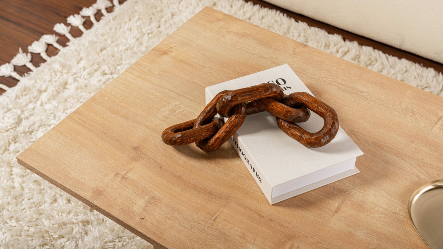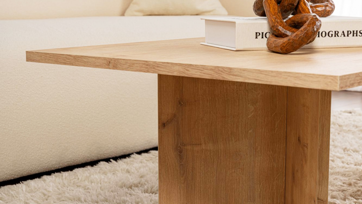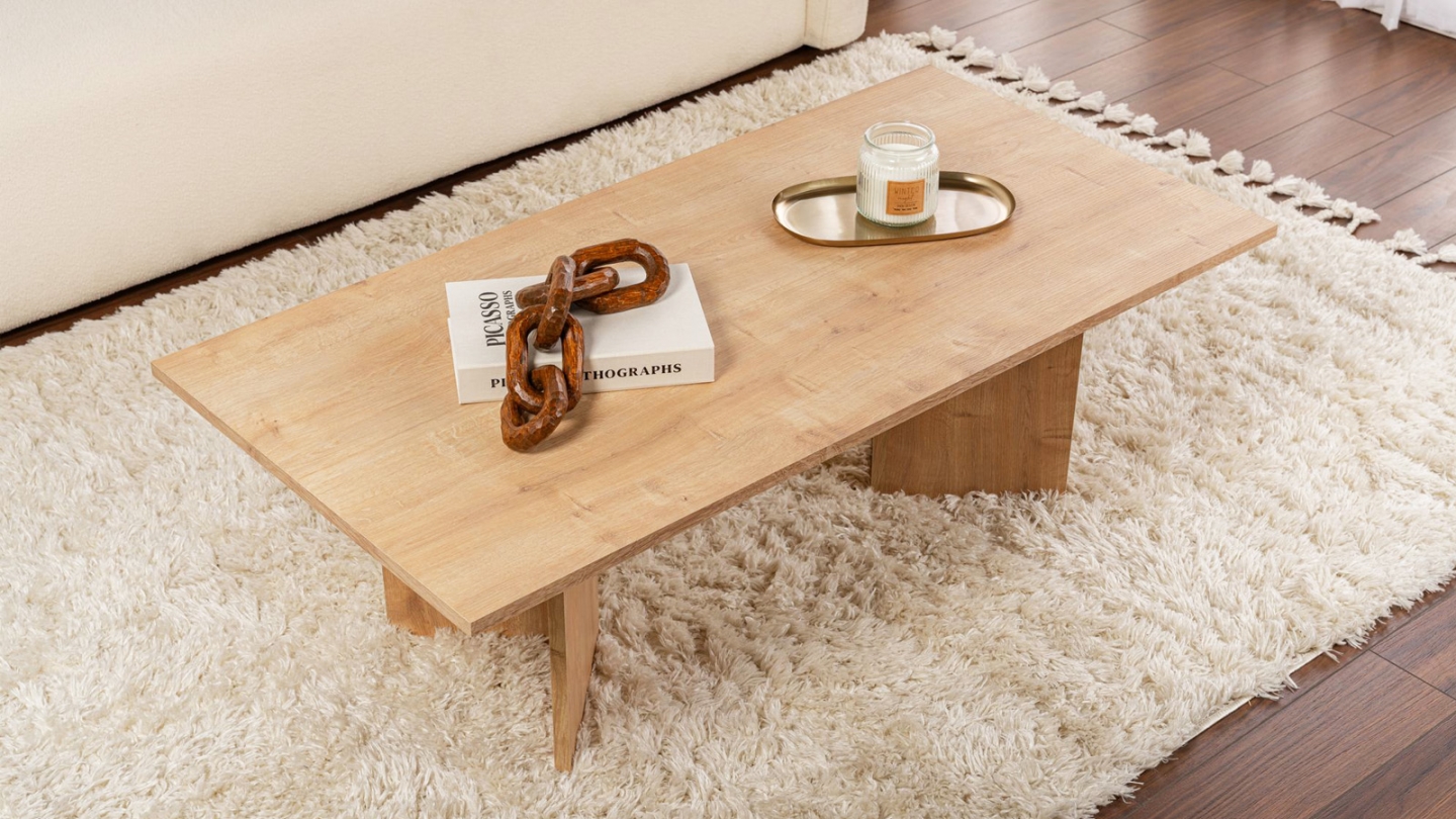 En stockTable basse - Taona• Matière : Mélamine• Couleur : Effet bois• Forme : rectangulaire• Piètement en panneaux croisés pour une silhouette épurée et contemporaine• Dimensions totales : 119 x 60 x 40 cm