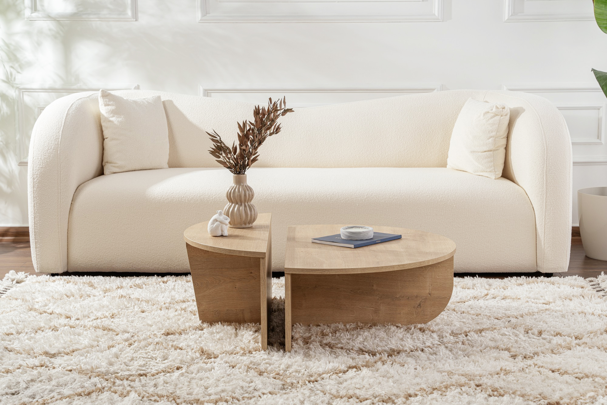En stockTable basse modulable - Selma• Matière : Mélamine• Couleur : Effet bois• Forme : ronde• Table basse modulable composée de deux éléments semi-circulaires, à utiliser ensemble ou séparément selon vos envies.• Dimensions totales : Partie 1 : 60 x 90 x 30 cm - Partie 2 : 30 x 85 x 35 cm