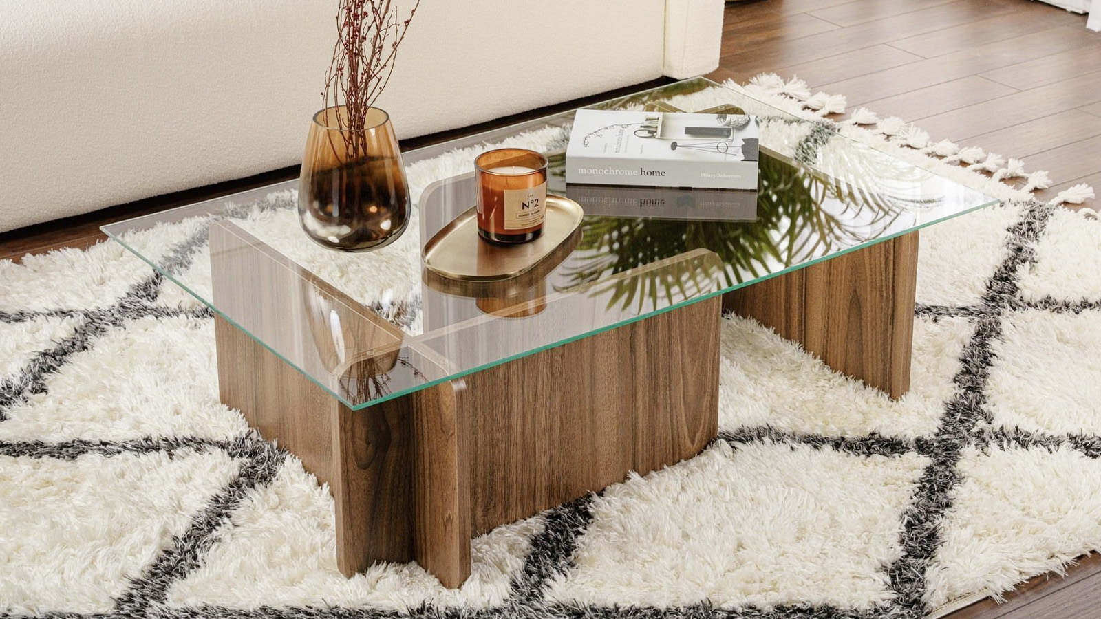 En stockTable basse - Naelis• Matière : Mélamine, verre trempé• Couleur : Effet Chêne• Forme : rectangulaire• Piètement asymétrique, pour un rendu moderne et épuré.• Dimensions totales : 105 x 65 x 30 cm