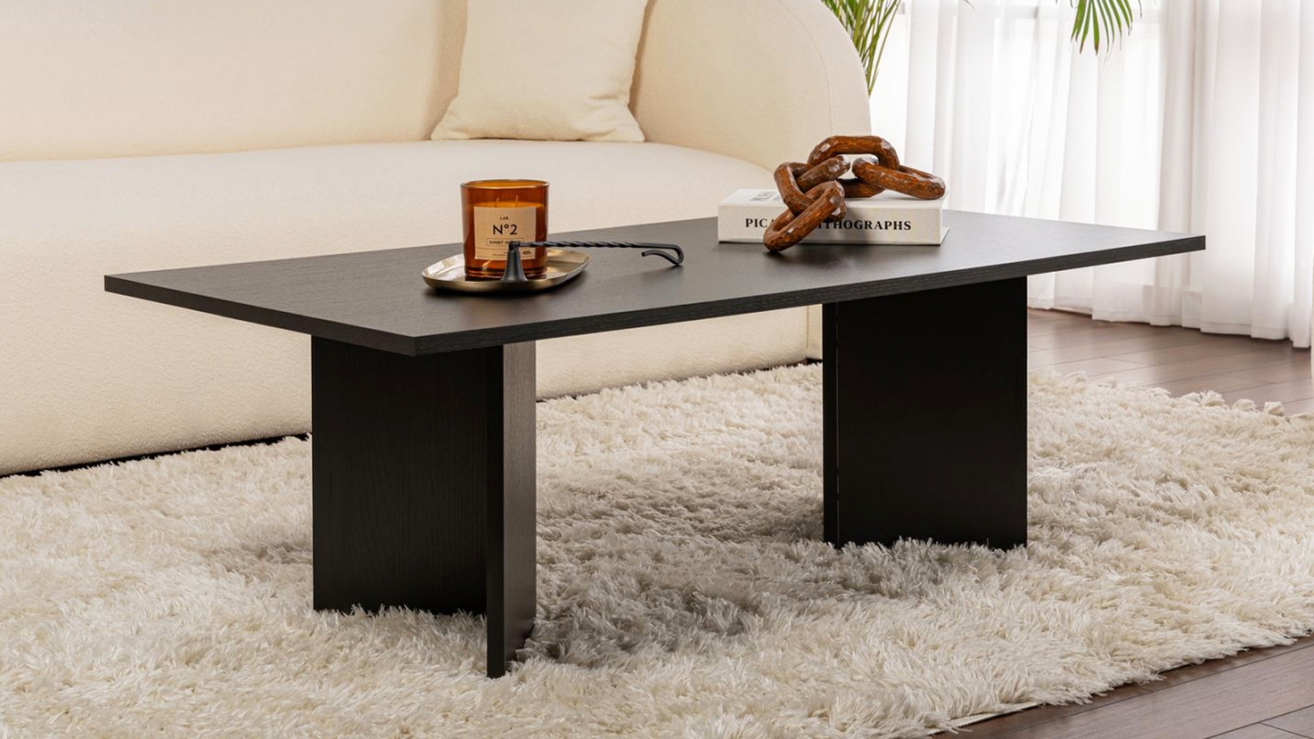Table basse - Aris • Une table basse moderne aux lignes épurées avec angles biseautés • Couleur : Cappuccino et noir • Matière principales : Bois • Forme : Rectangulaire • Dimensions totales : 94 x 55 x 40 cm • Rangements : 2 niches (44,3 x 21,6 cm) et 2 tiroirs • Design sans poignées pour une allure minimaliste