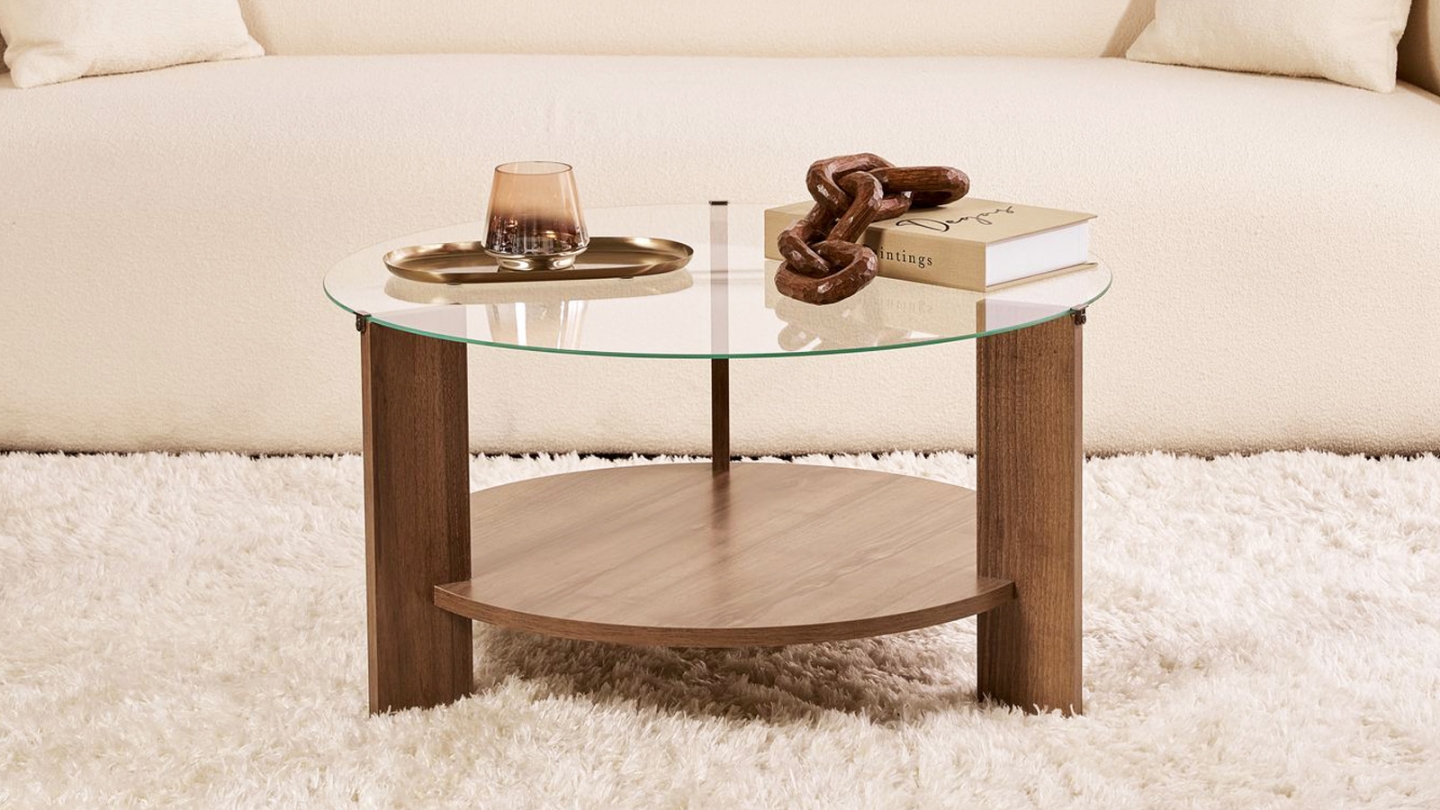 Table basse - Elora• Matière : Mélamine, verre trempé• Couleur : Effet Chêne - Plateau en verre fumé• Forme : ronde• Plateau inférieur en bois Ø63 cm - Plateau supérieur en verre Ø75 cm• Dimensions totales : 75 x 75 x 40 cm