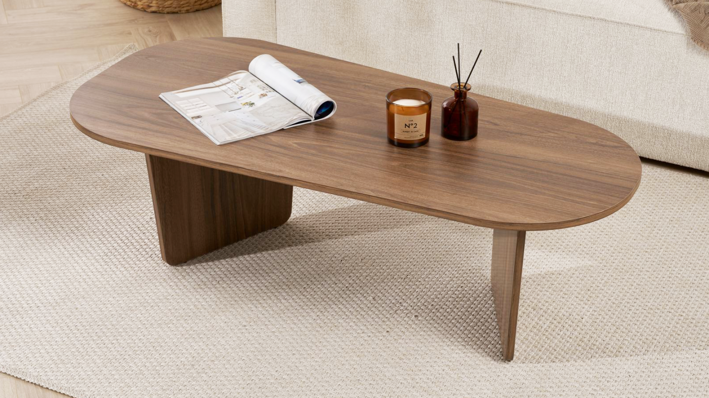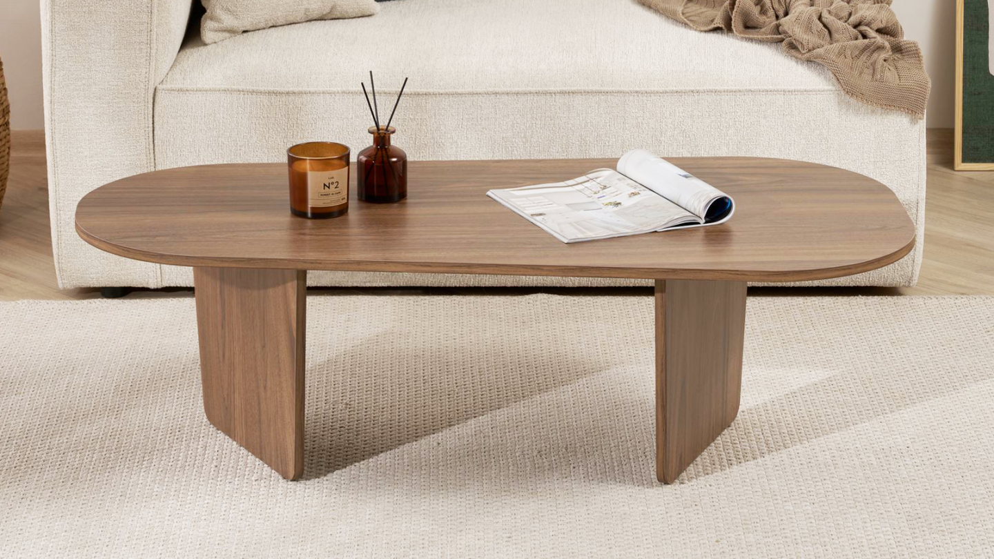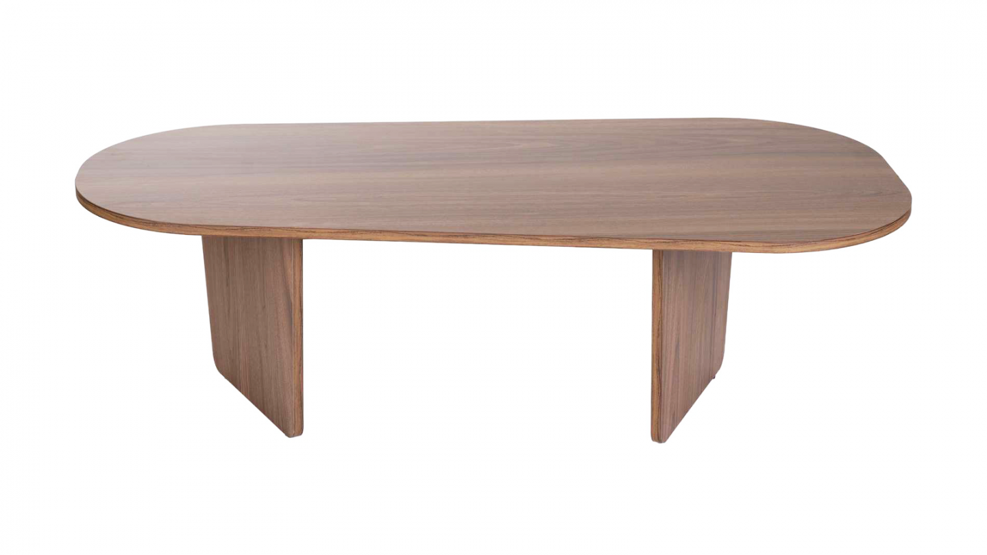 Table basse - Ceane• Matière : Mélamine• Couleur : Effet bois• Table basse de forme ovale asymétrique, soutenue par deux pieds pleins obliques pour un style moderne et harmonieux.• Dimensions totales : 130 x 65 x 40 cm