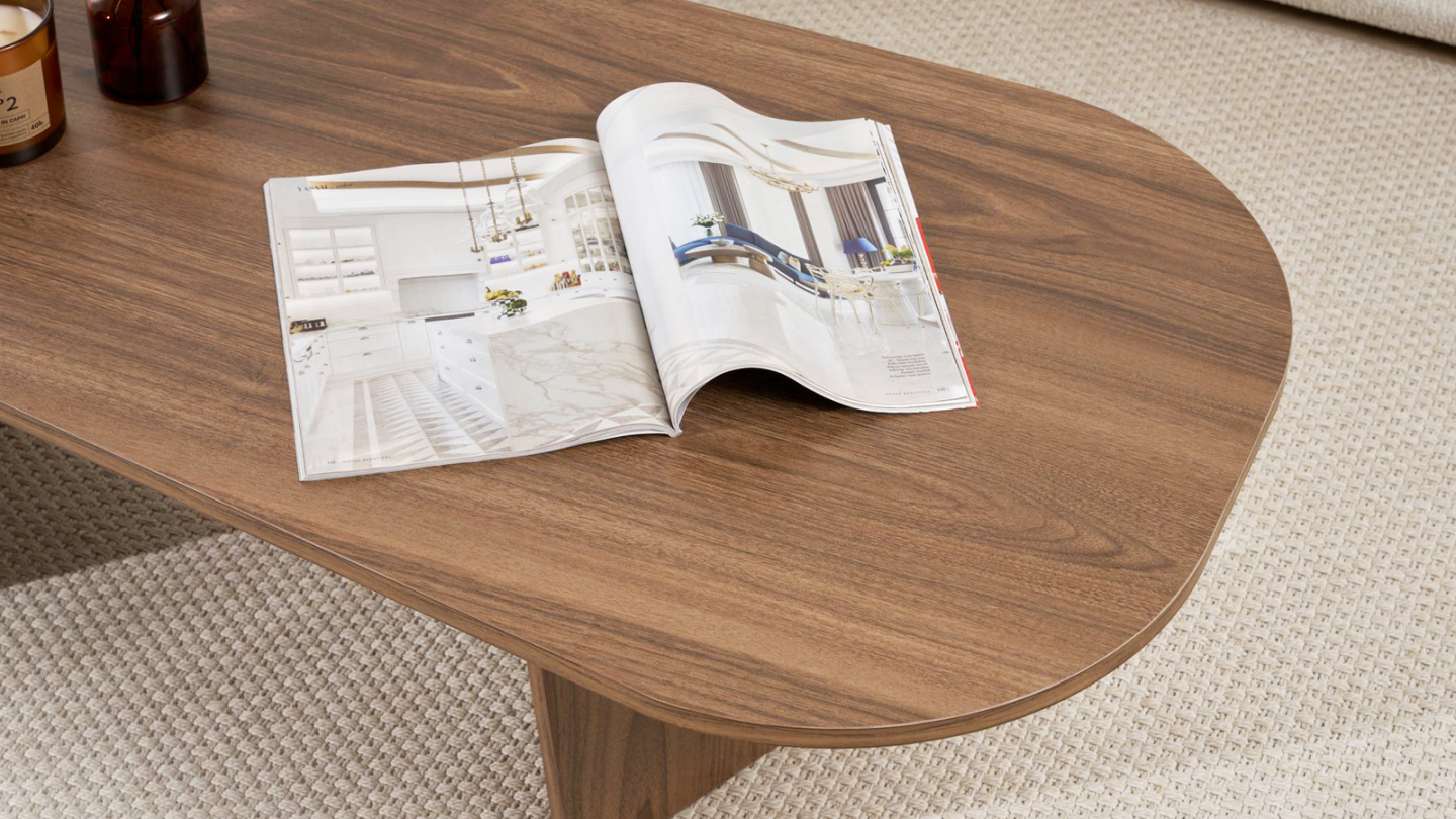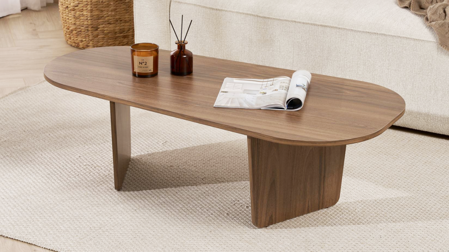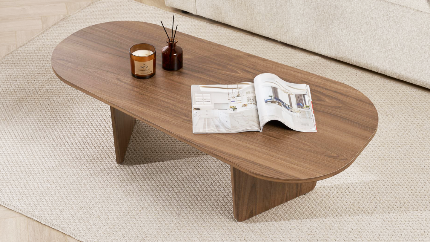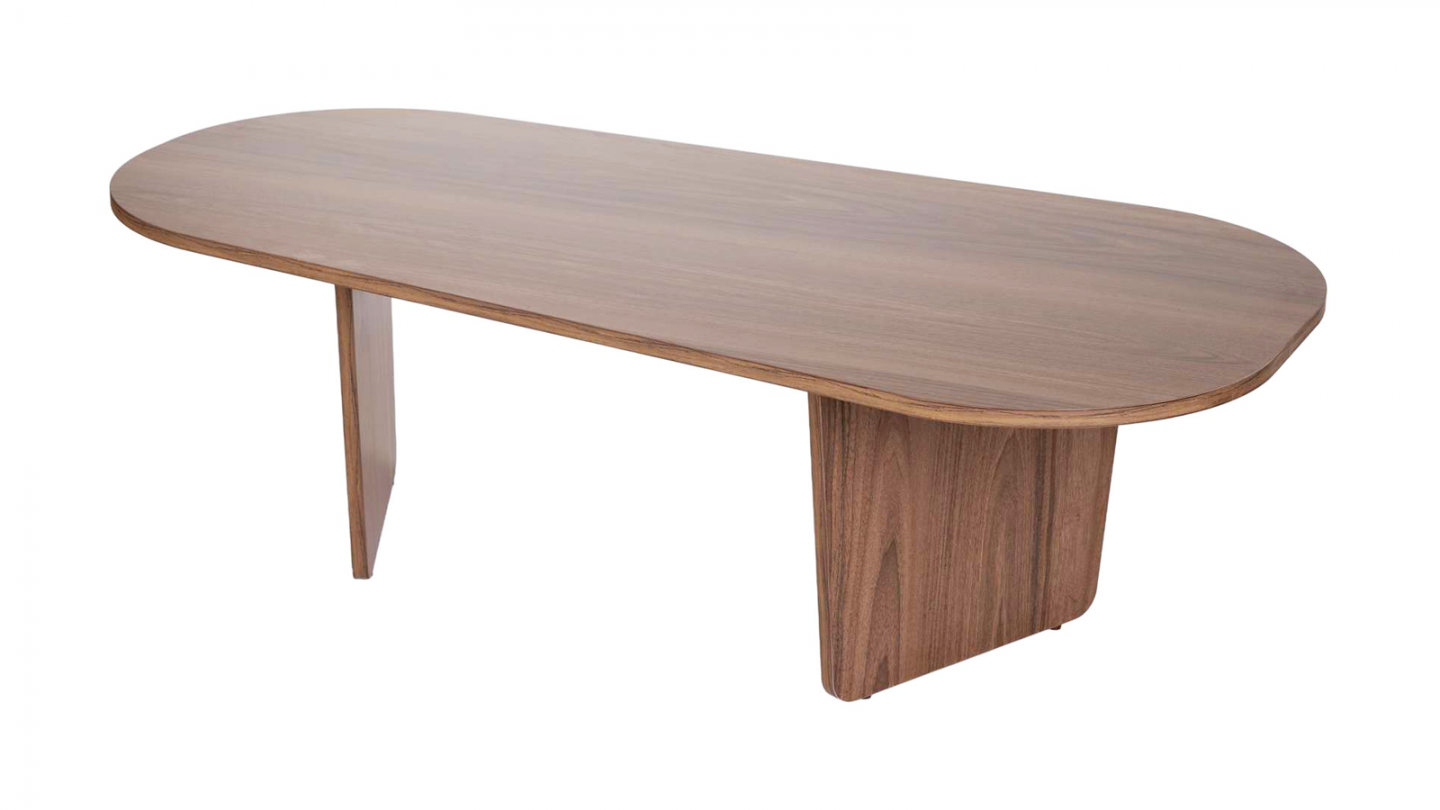 Table basse - Ceane• Matière : Mélamine• Couleur : Effet bois• Table basse de forme ovale asymétrique, soutenue par deux pieds pleins obliques pour un style moderne et harmonieux.• Dimensions totales : 130 x 65 x 40 cm