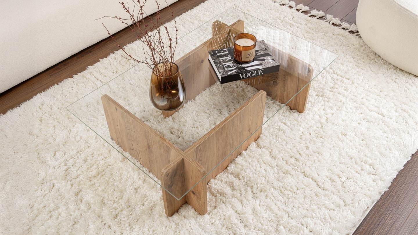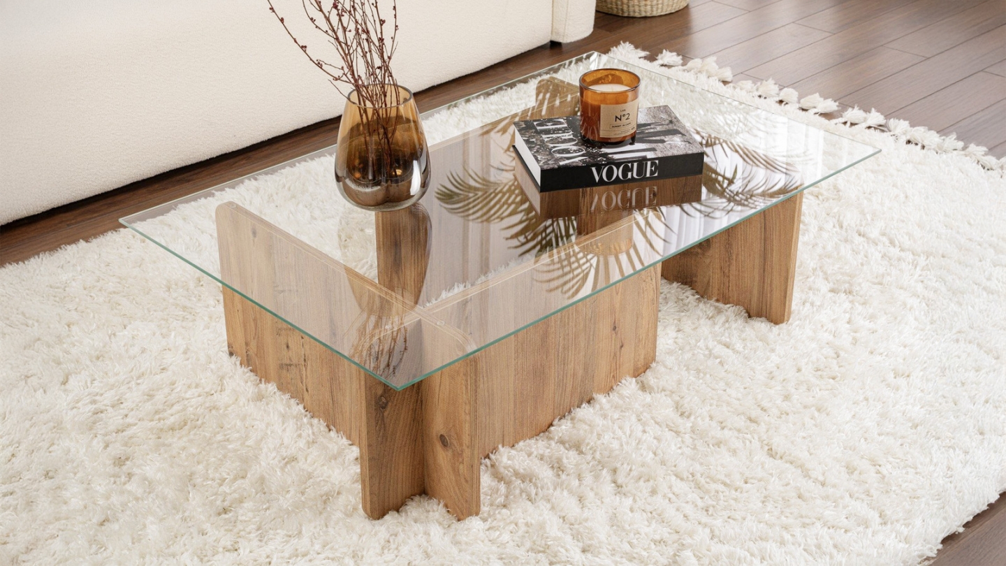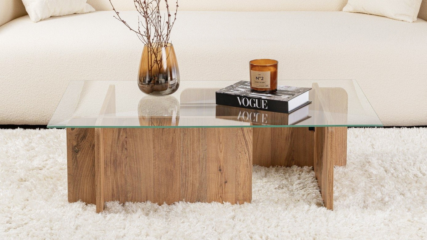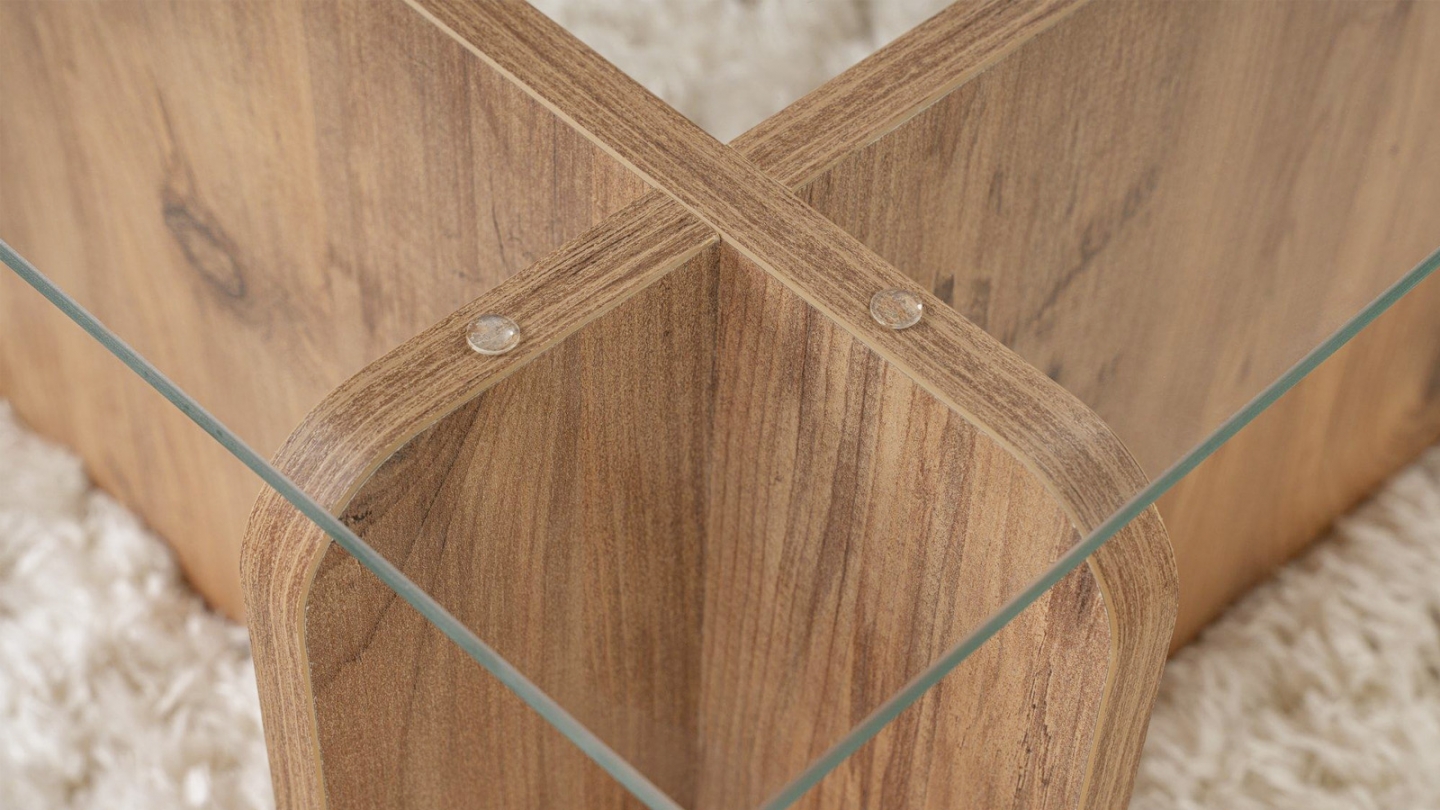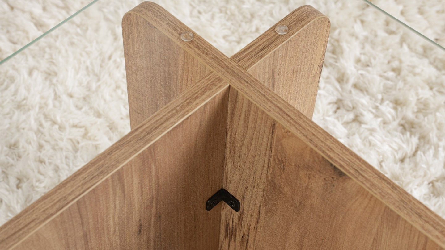 En stockTable basse - Naelis• Matière : Mélamine, verre trempé• Couleur : Effet Chêne• Forme : rectangulaire• Piètement asymétrique, pour un rendu moderne et épuré.• Dimensions totales : 105 x 65 x 30 cm