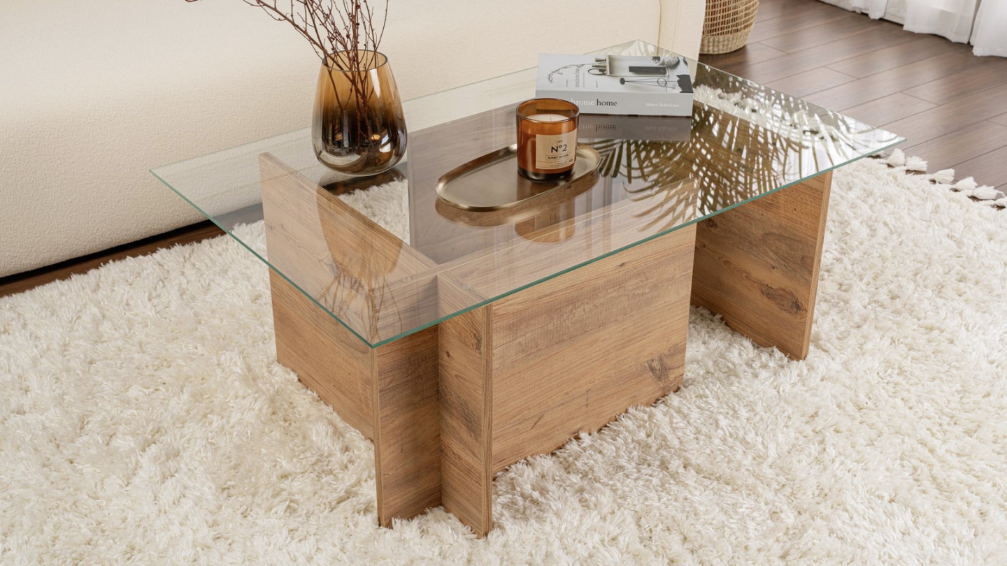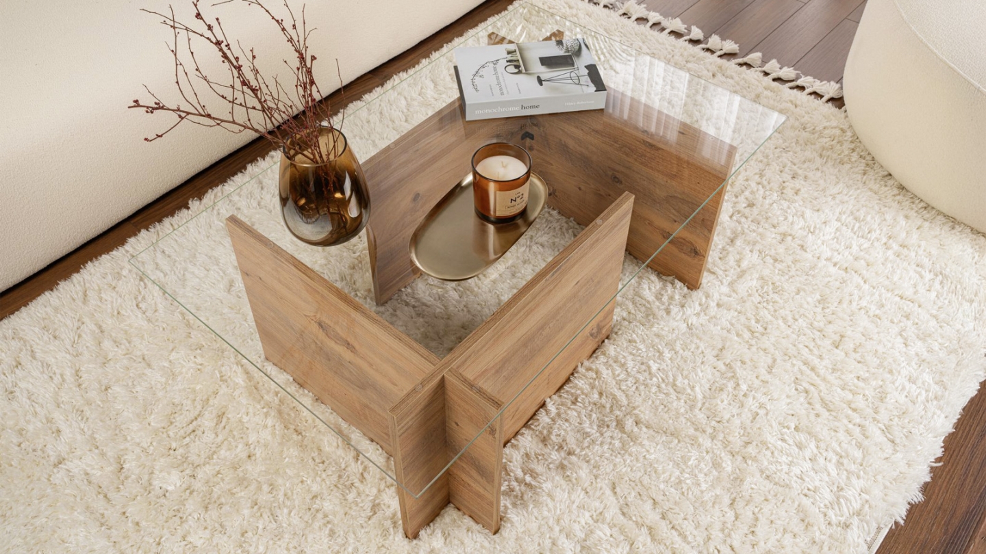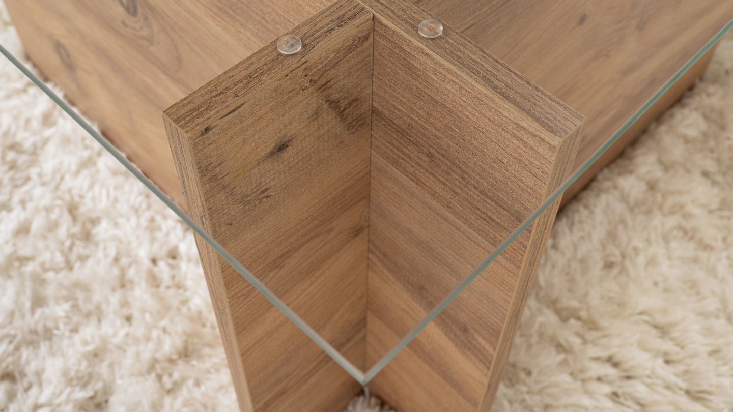 • Design graphique, associant un plateau en verre à un piètement asymétrique croisé en bois au style contemporain