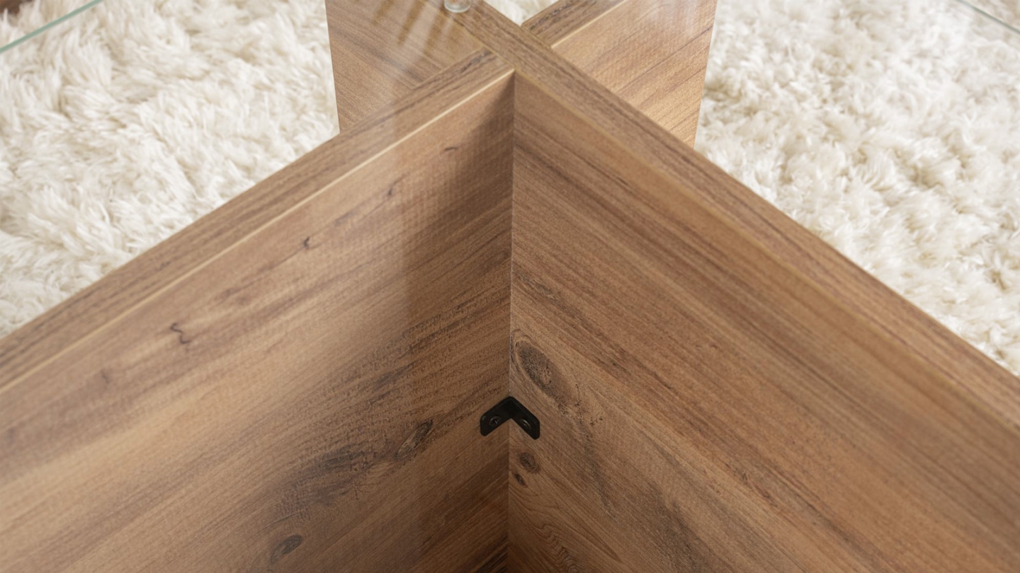 Table basse - Kael• Matière : Mélamine, verre trempé• Couleur : Effet Noyer• Forme : rectangulaire• Design graphique, associant un plateau en verre à un piètement asymétrique croisé en bois au style contemporain• Dimensions totales : 105 x 65 x 40 cm