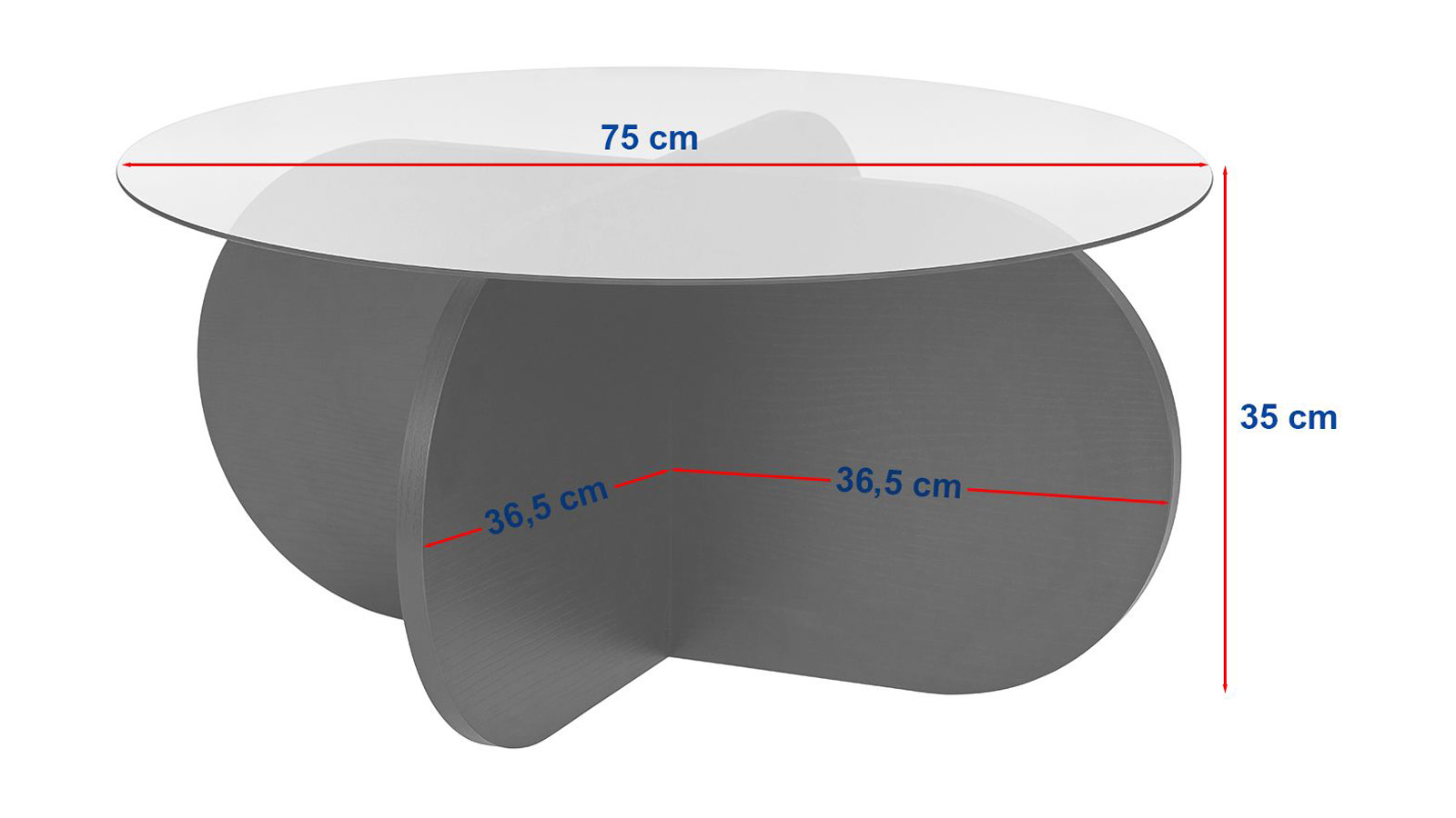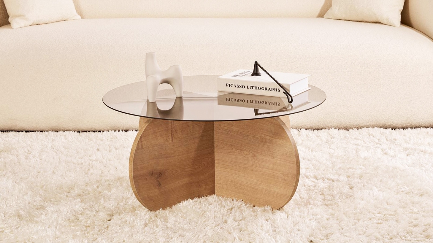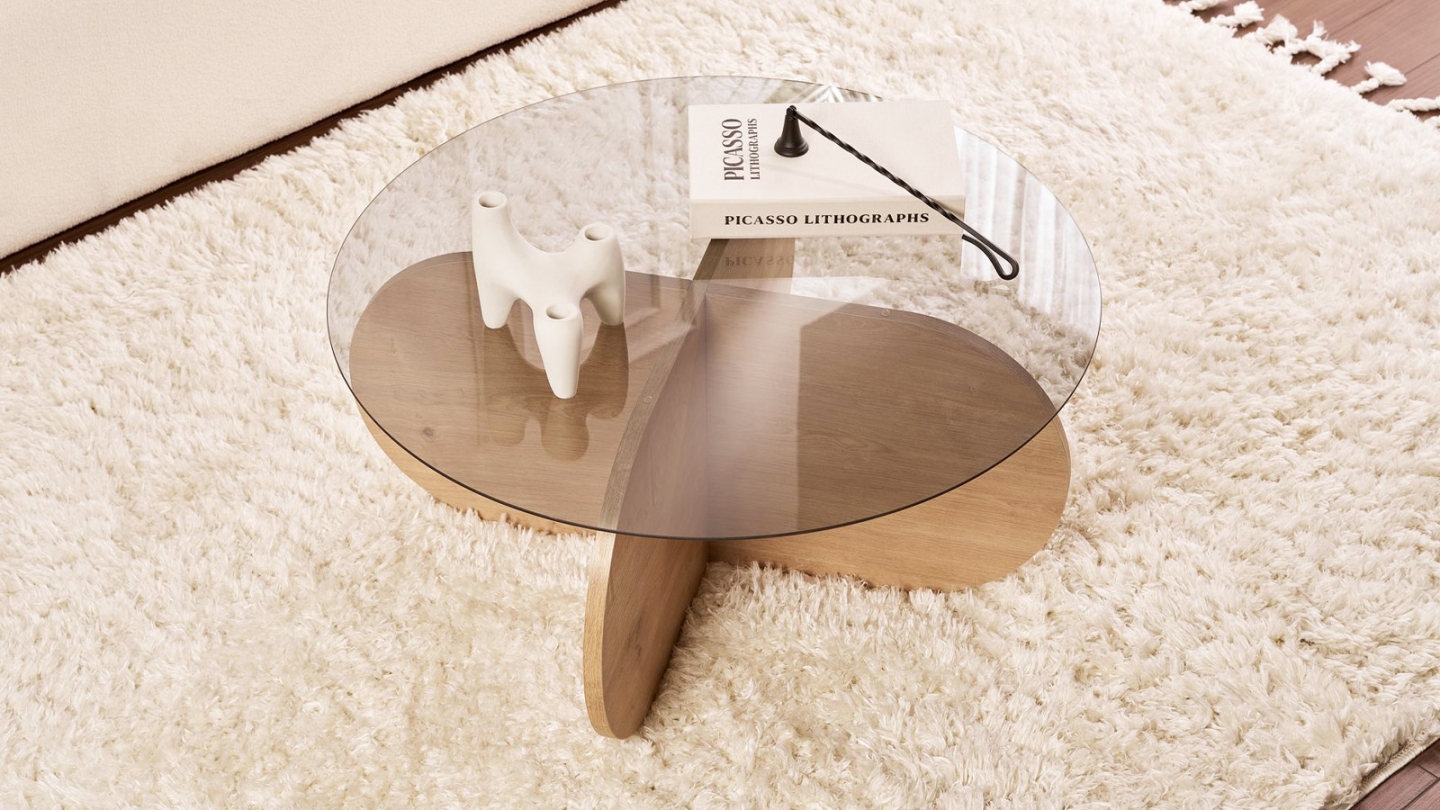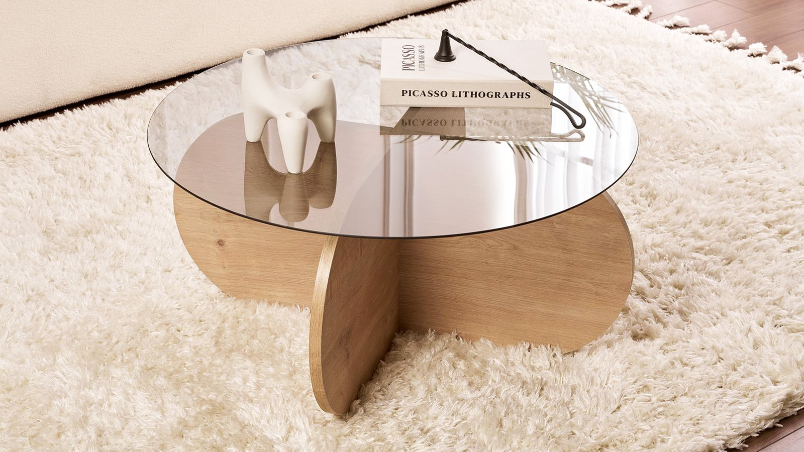 Table basse - Eolia• Matière : Mélamine, verre trempé• Couleur : Effet Chêne - Plateau en verre transparent• Forme : ronde• Piètement croisé aux formes organiques, pour une allure contemporaine et légère• Dimensions totales : 75 x 75 x 35 cm