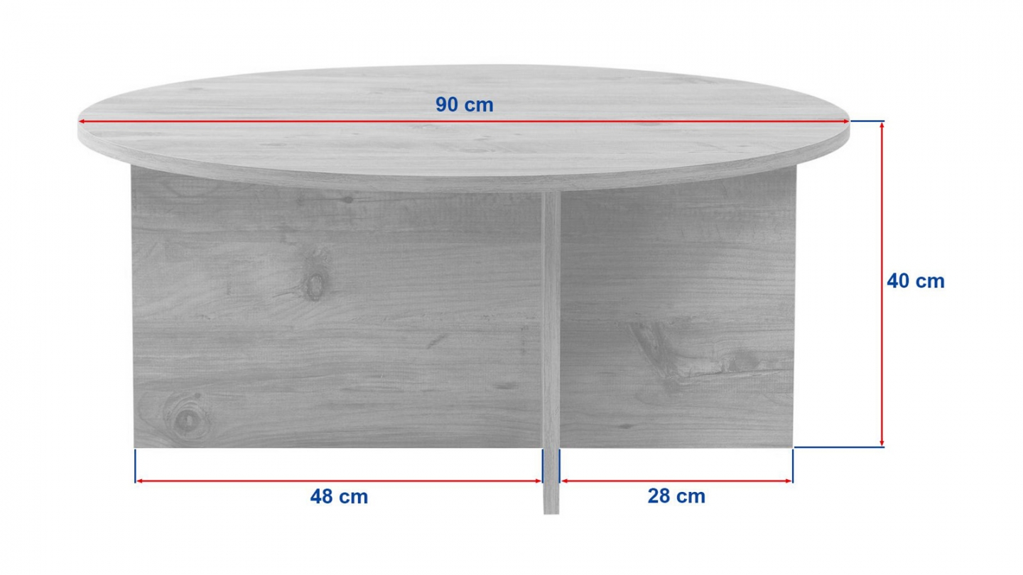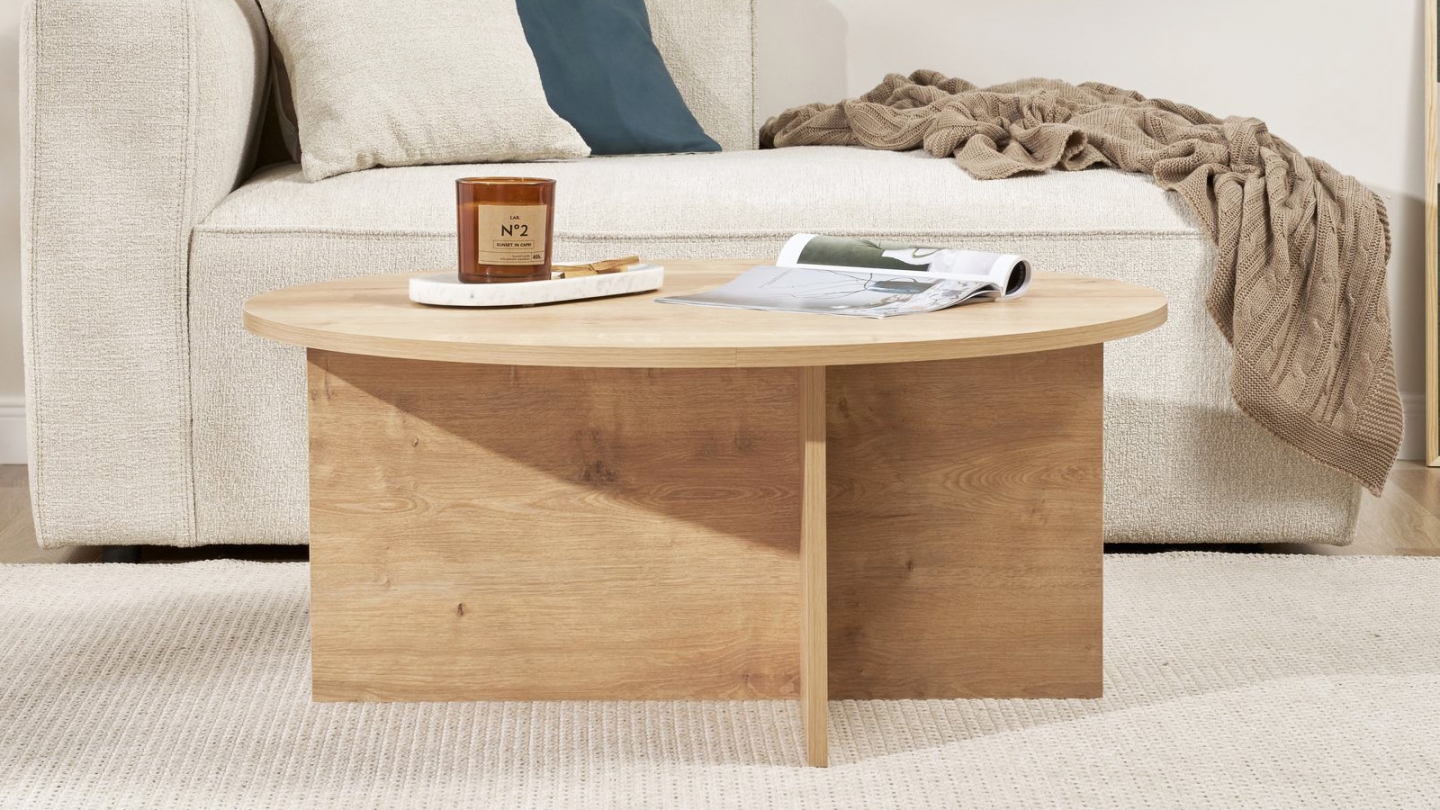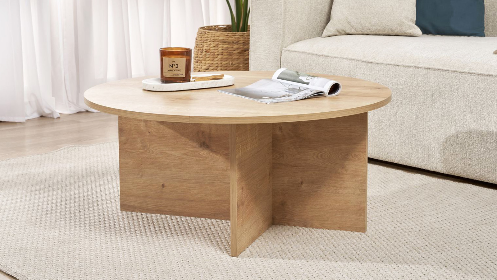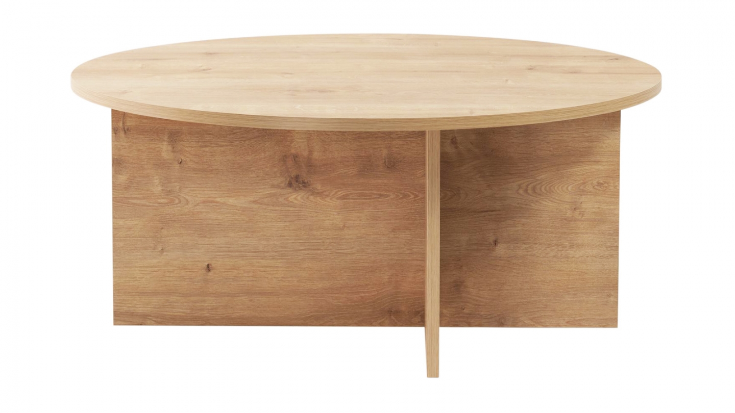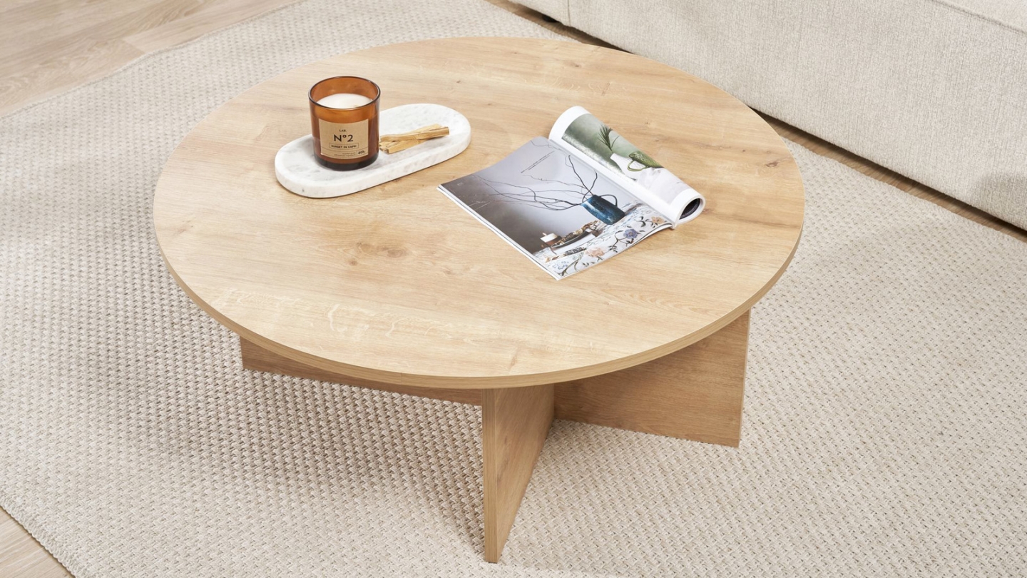 En stockTable basse - Zelis• Matière : Mélamine• Couleur : Effet Noyer• Forme : ronde• Design épuré, porté par un piètement croisé asymétrique au style contemporain• Dimensions totales : 90 x 90 x 40 cm