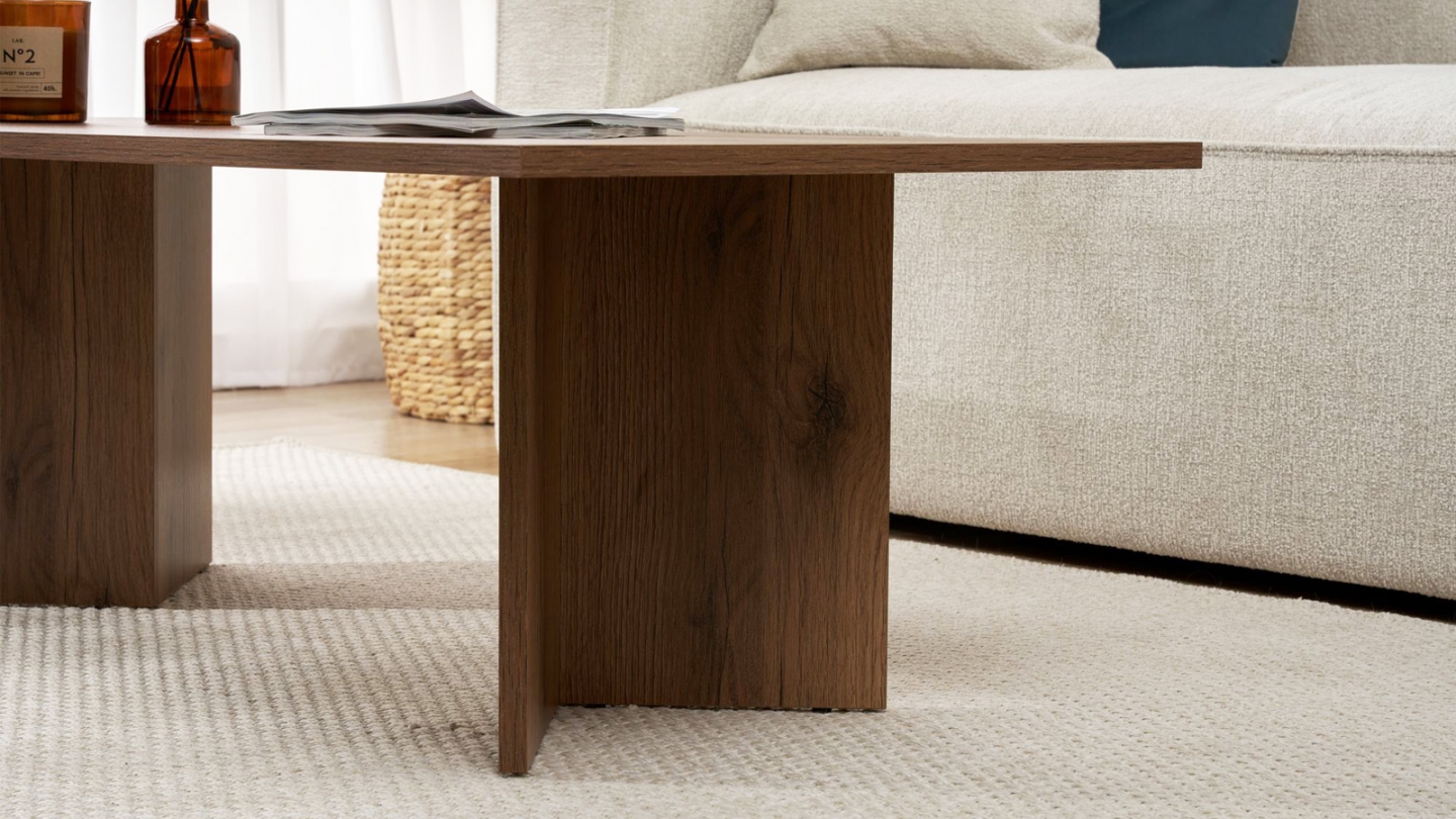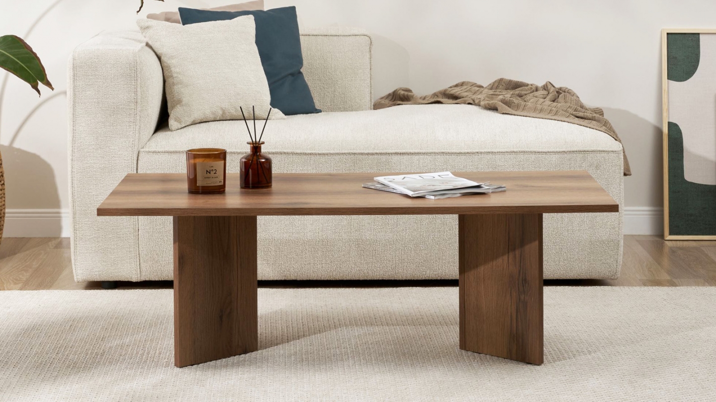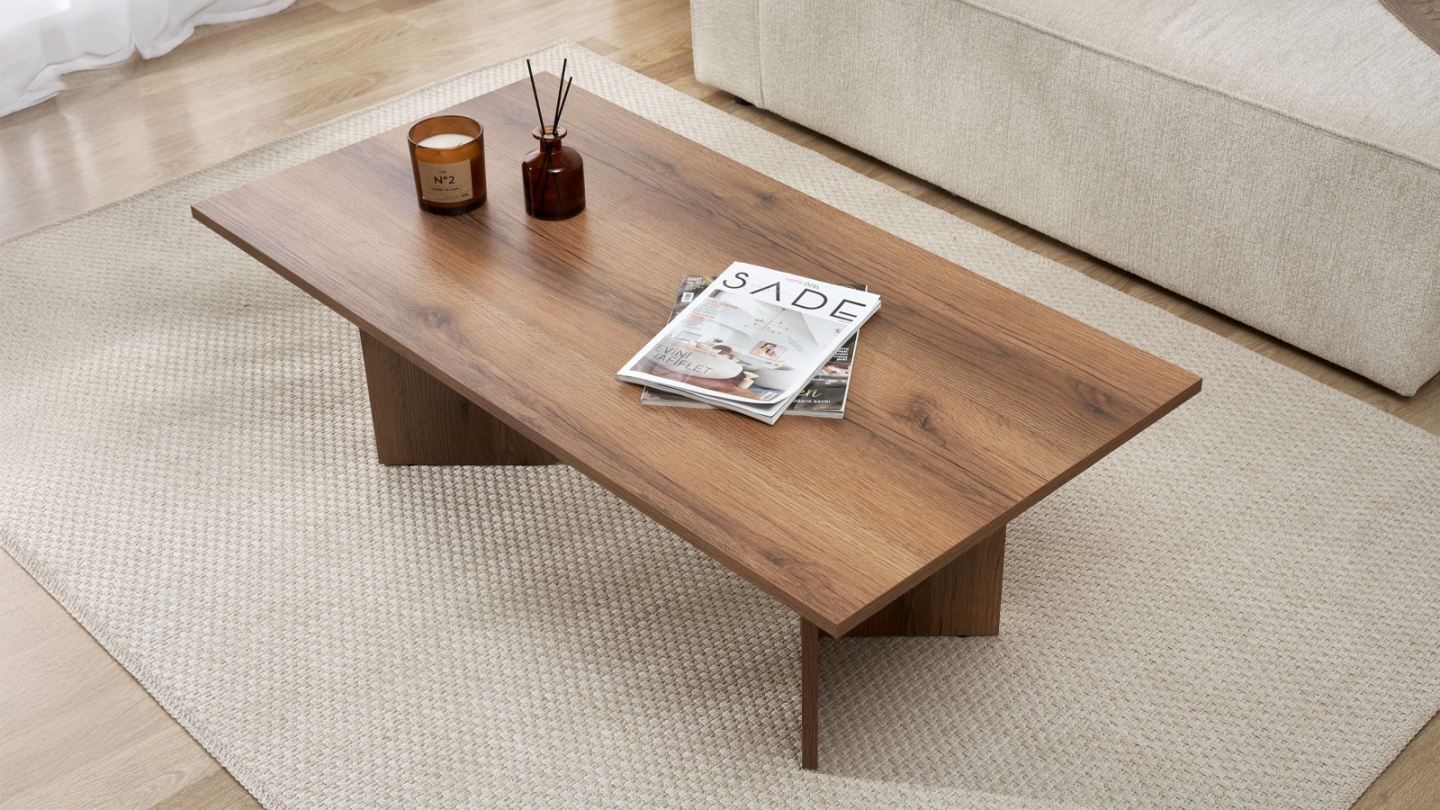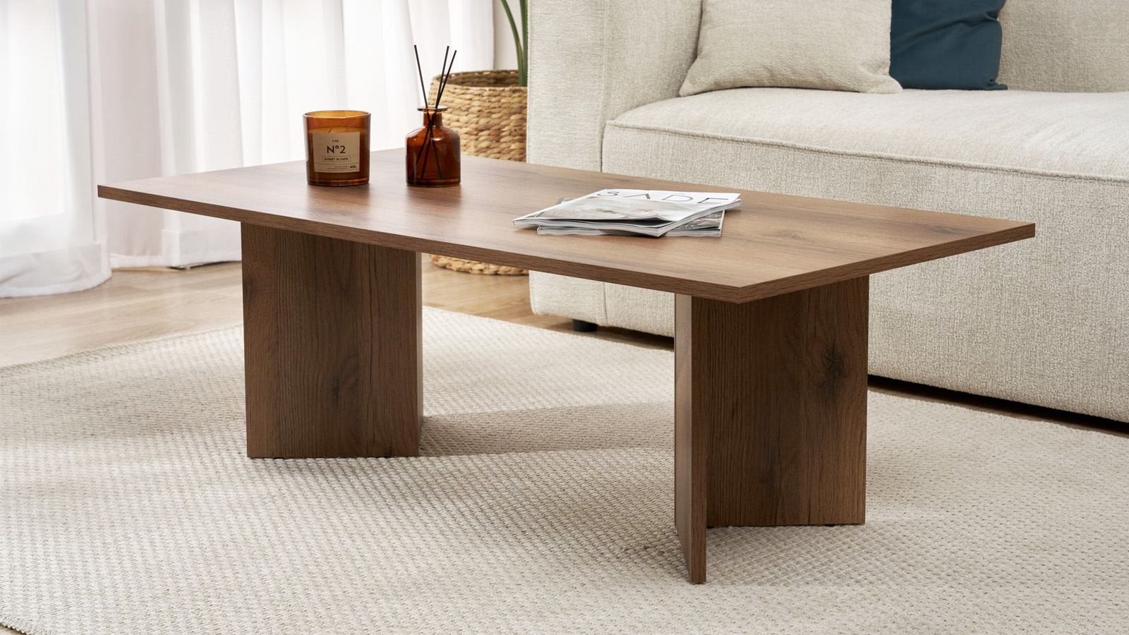 Table basse - Taona• Matière : Mélamine• Couleur : Effet Noyer• Forme : rectangulaire• Piètement en panneaux croisés pour une silhouette épurée et contemporaine• Dimensions totales : 119 x 60 x 40 cm