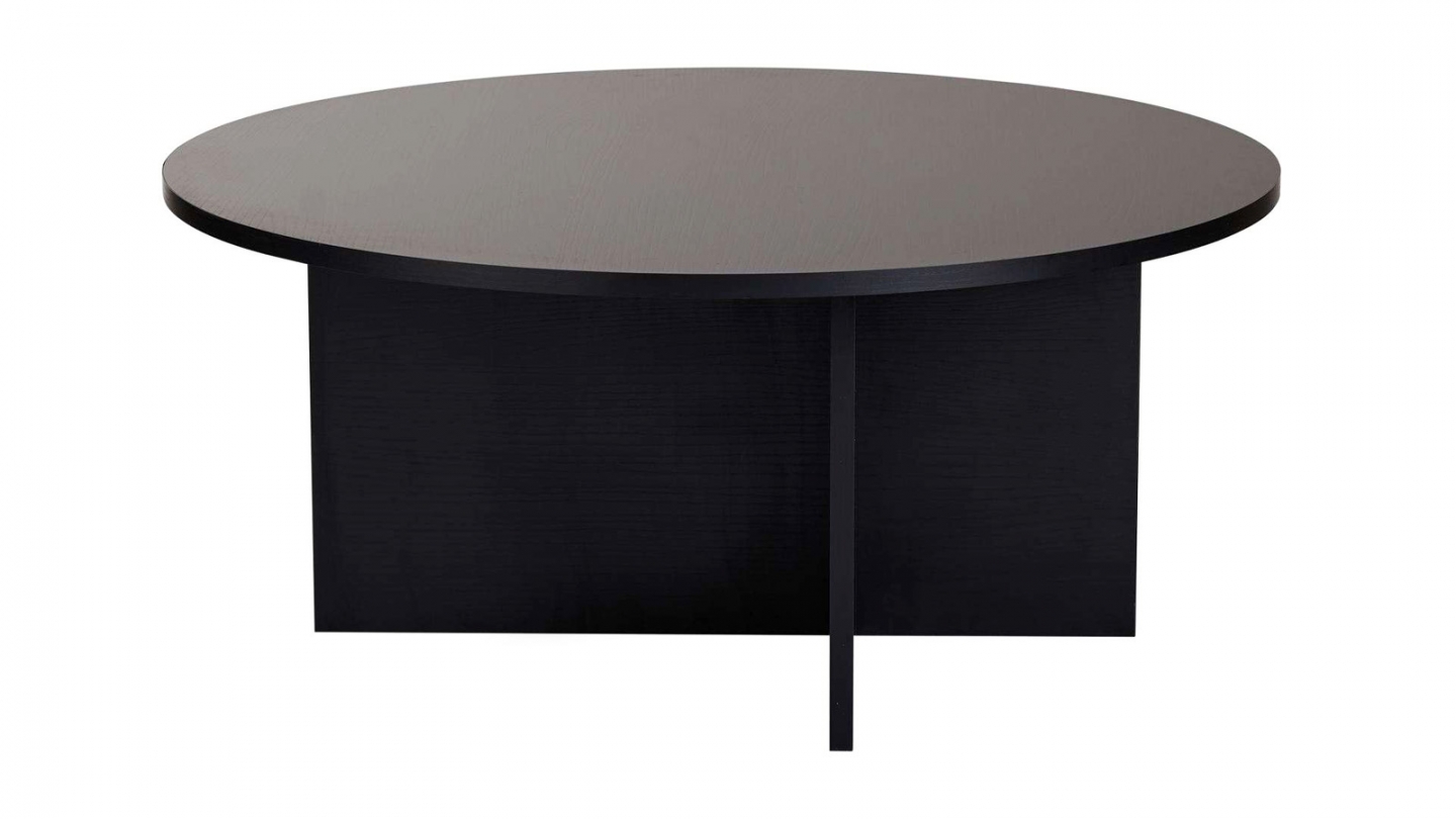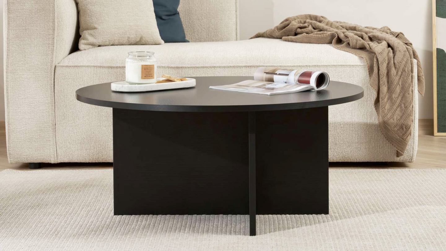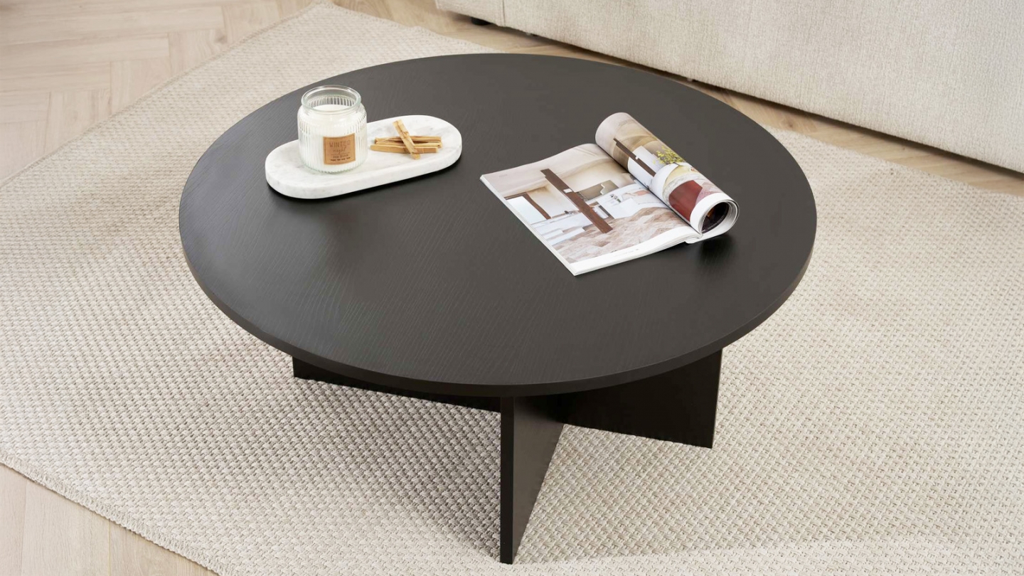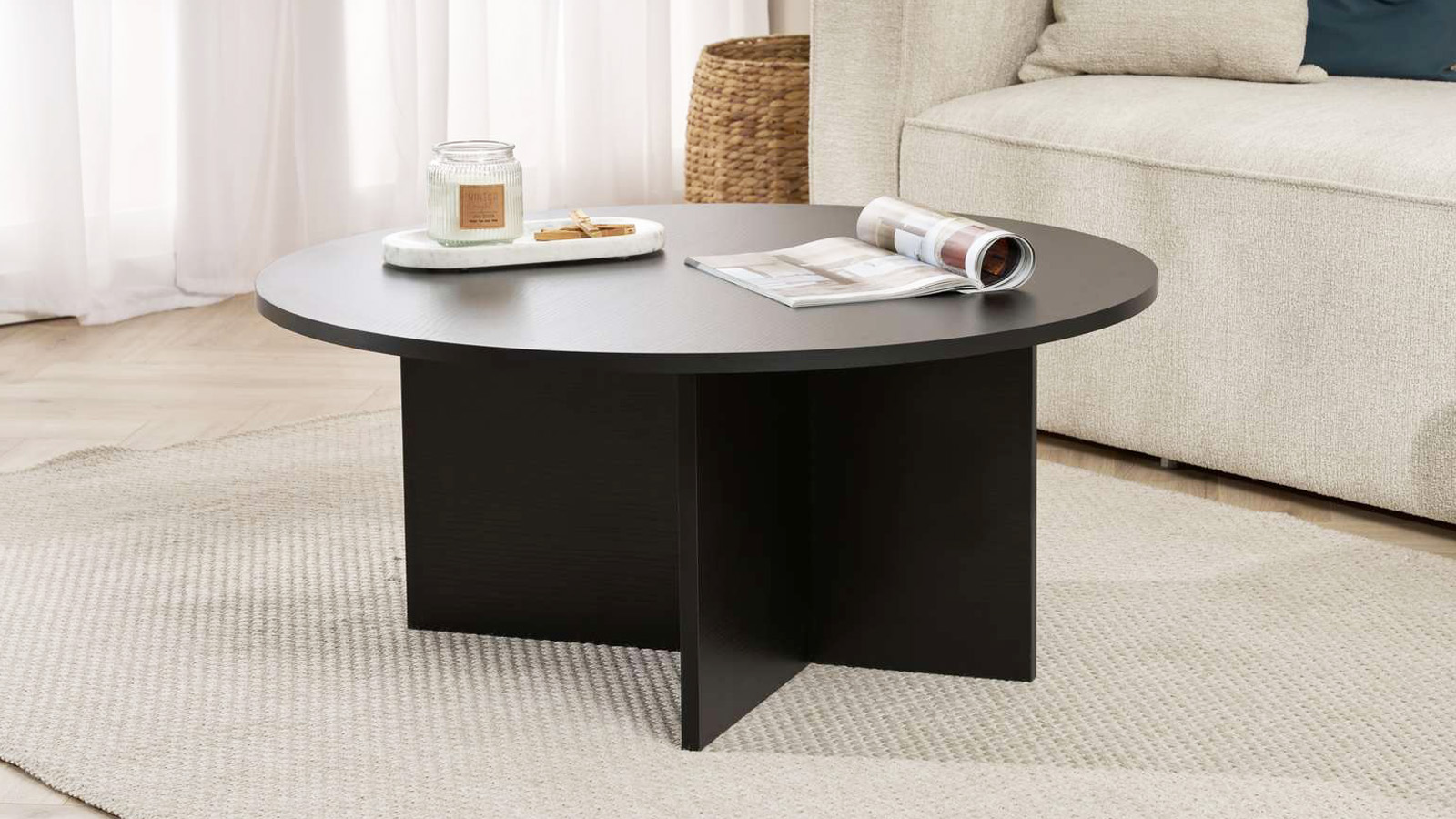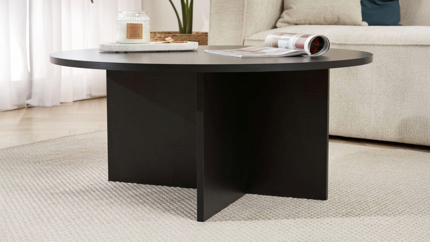 En stockTable basse - Zelis• Matière : Mélamine• Couleur : Effet Noyer• Forme : ronde• Design épuré, porté par un piètement croisé asymétrique au style contemporain• Dimensions totales : 90 x 90 x 40 cm