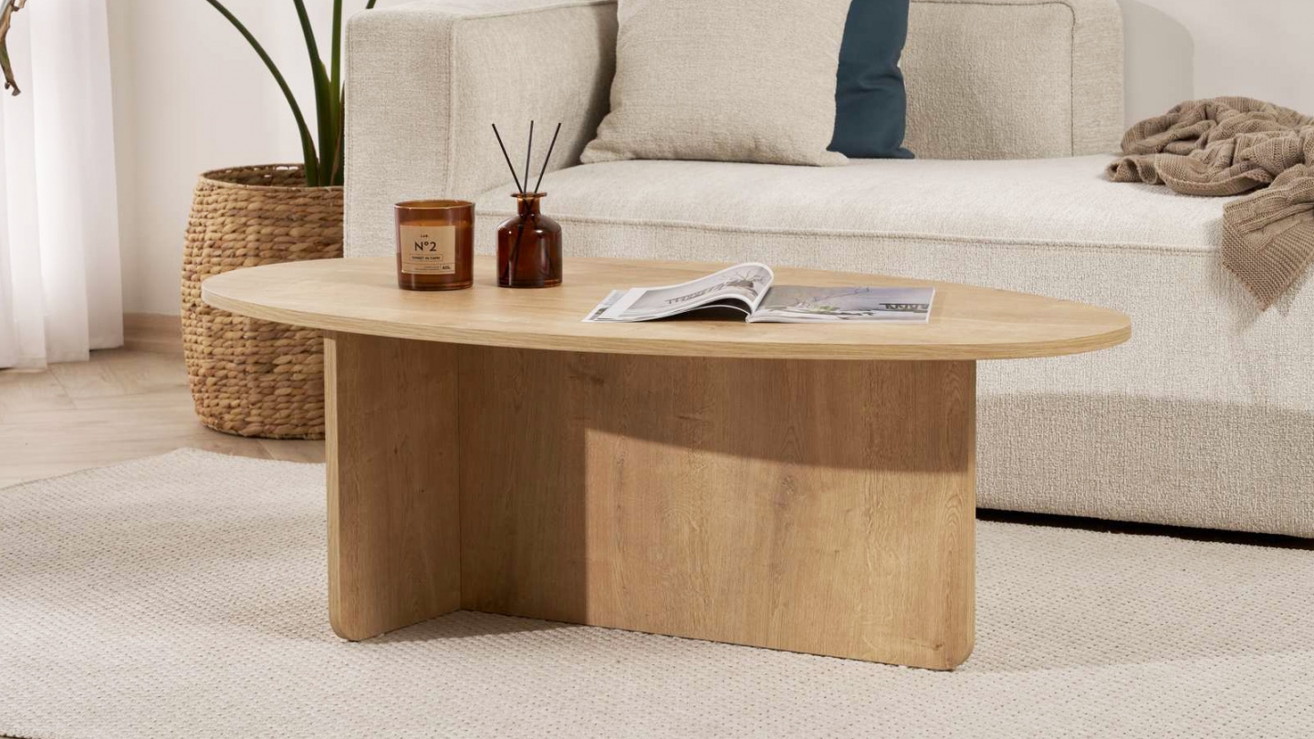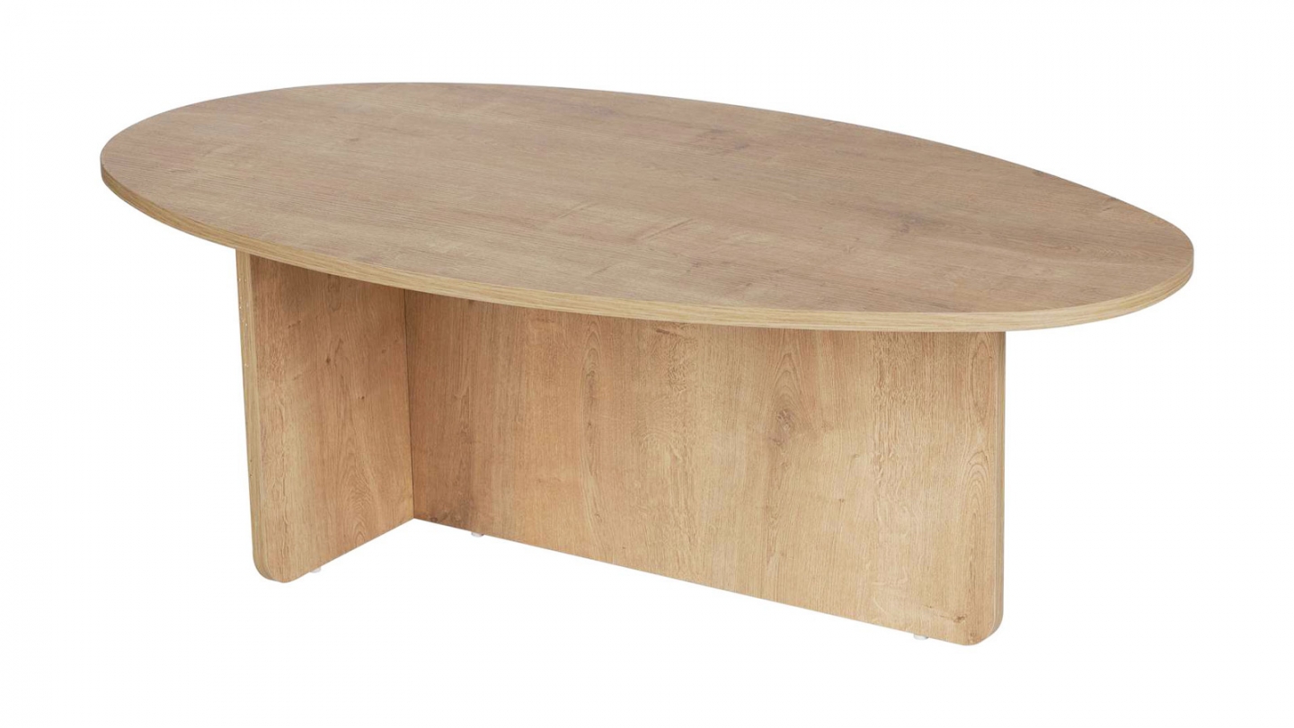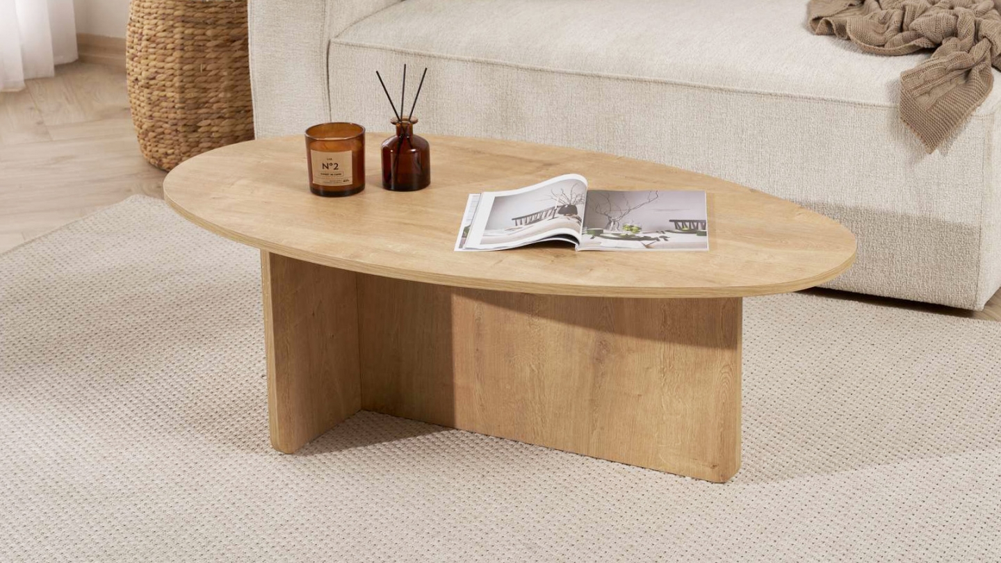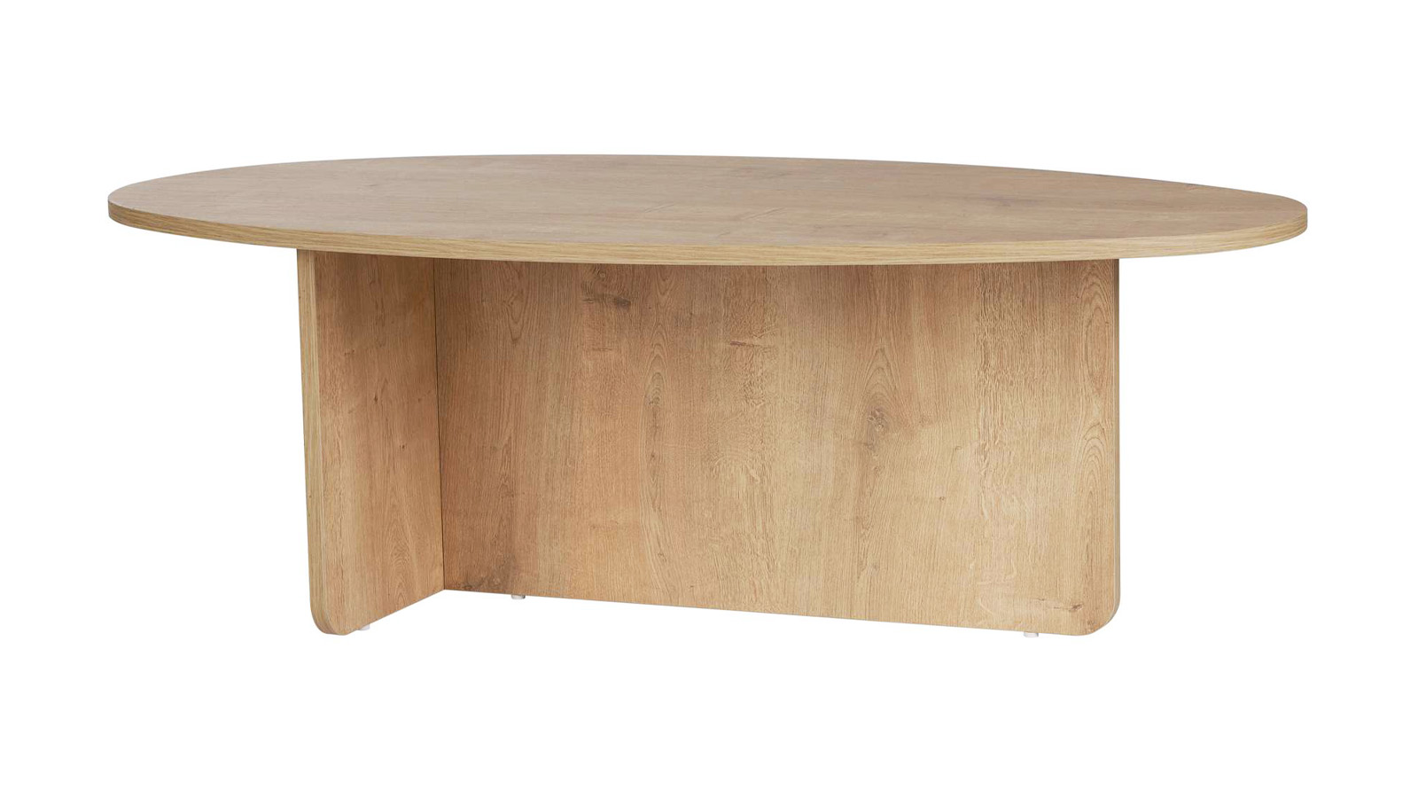 En stockTable basse - Nira• Matière : Mélamine• Couleur : Effet bois• Forme organique et piètement en T asymétrique pour un rendu naturel et contemporain.• Dimensions totales : 120 x 65 x 40 cm
