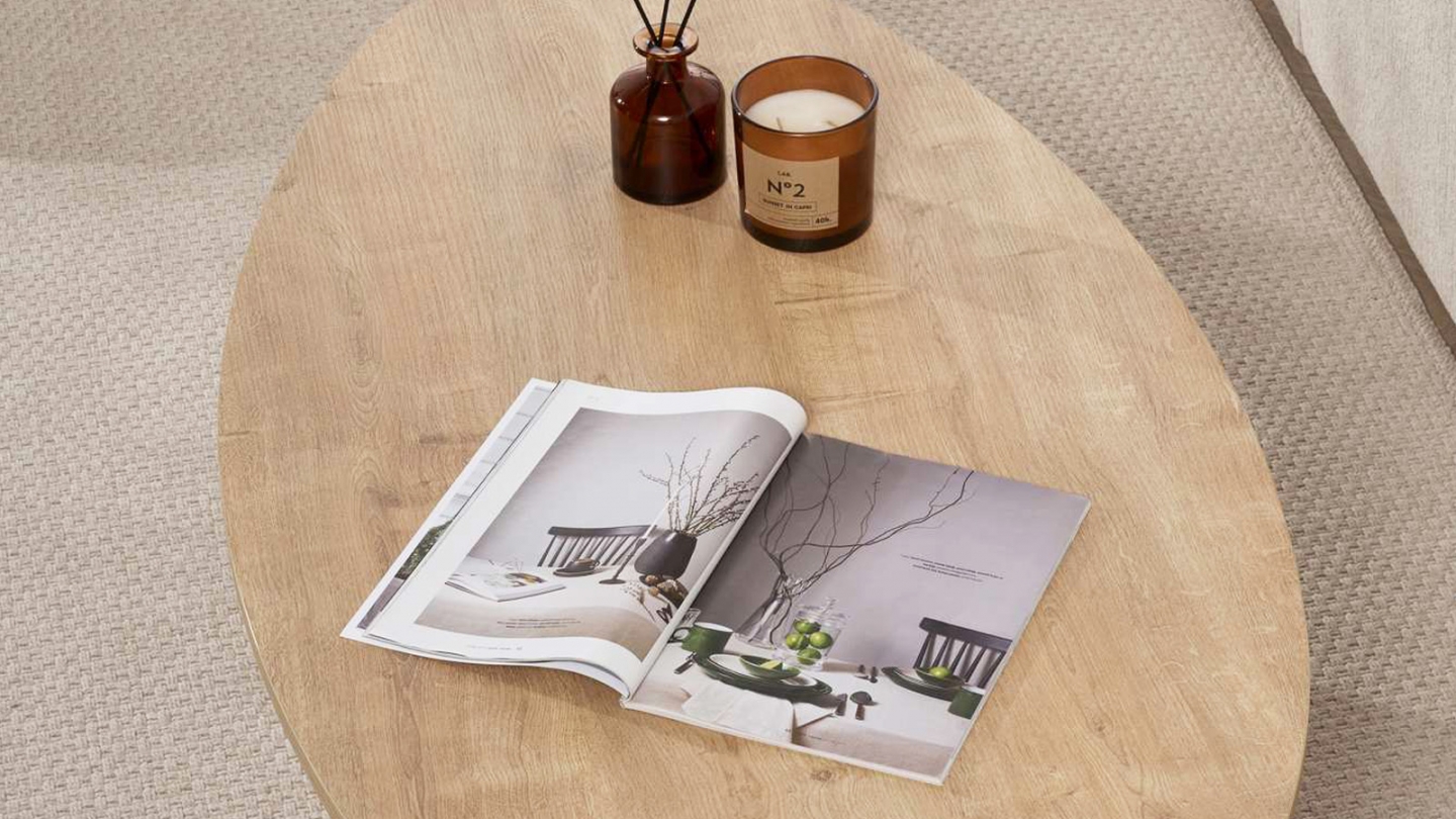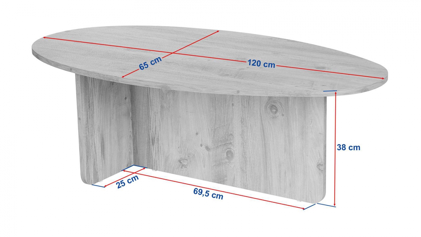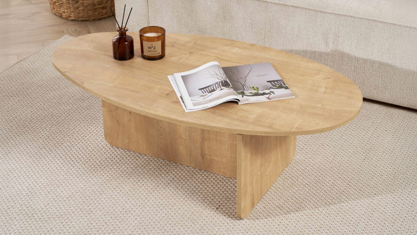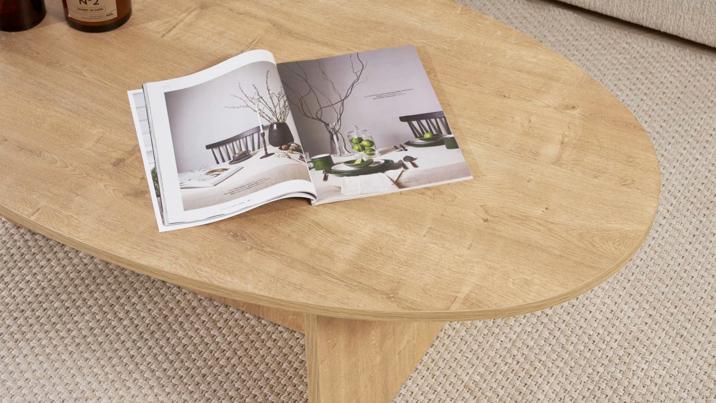 En stockTable basse - Nira• Matière : Mélamine• Couleur : Effet bois• Forme organique et piètement en T asymétrique pour un rendu naturel et contemporain.• Dimensions totales : 120 x 65 x 40 cm