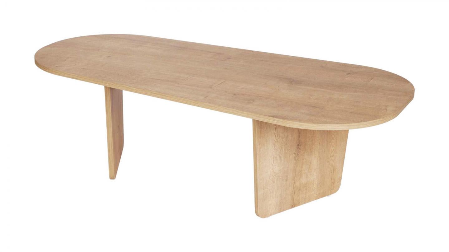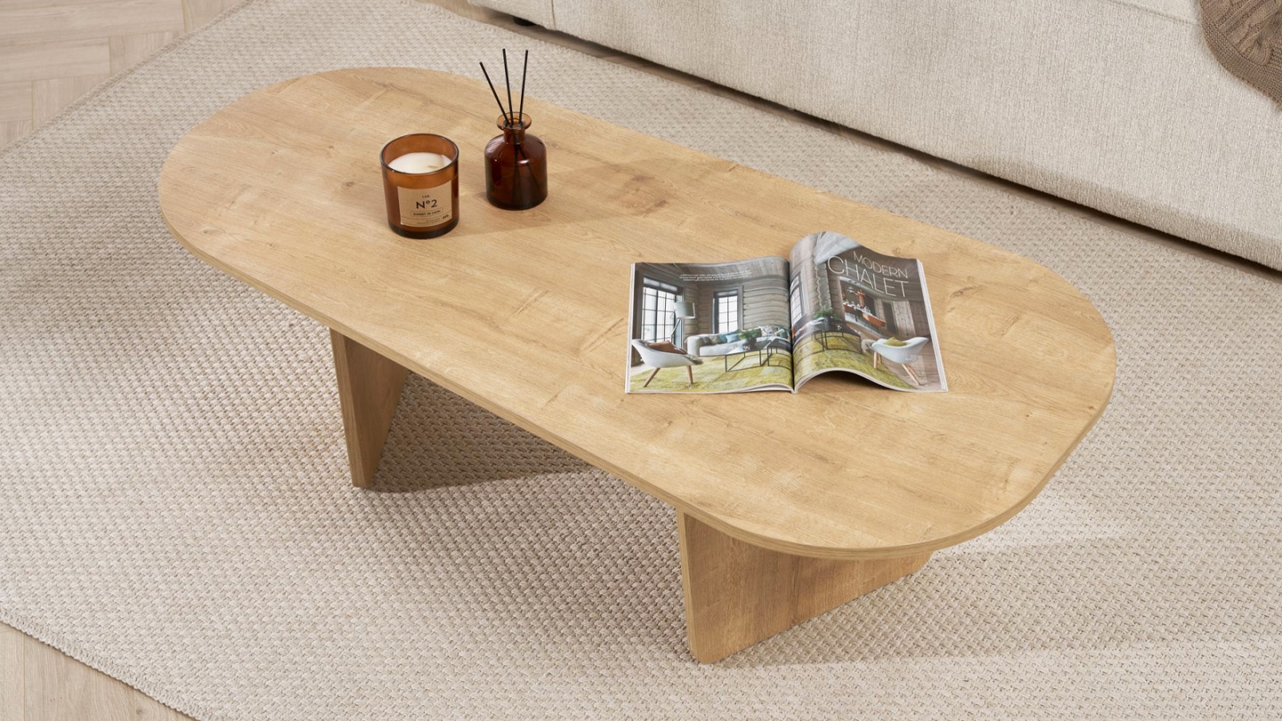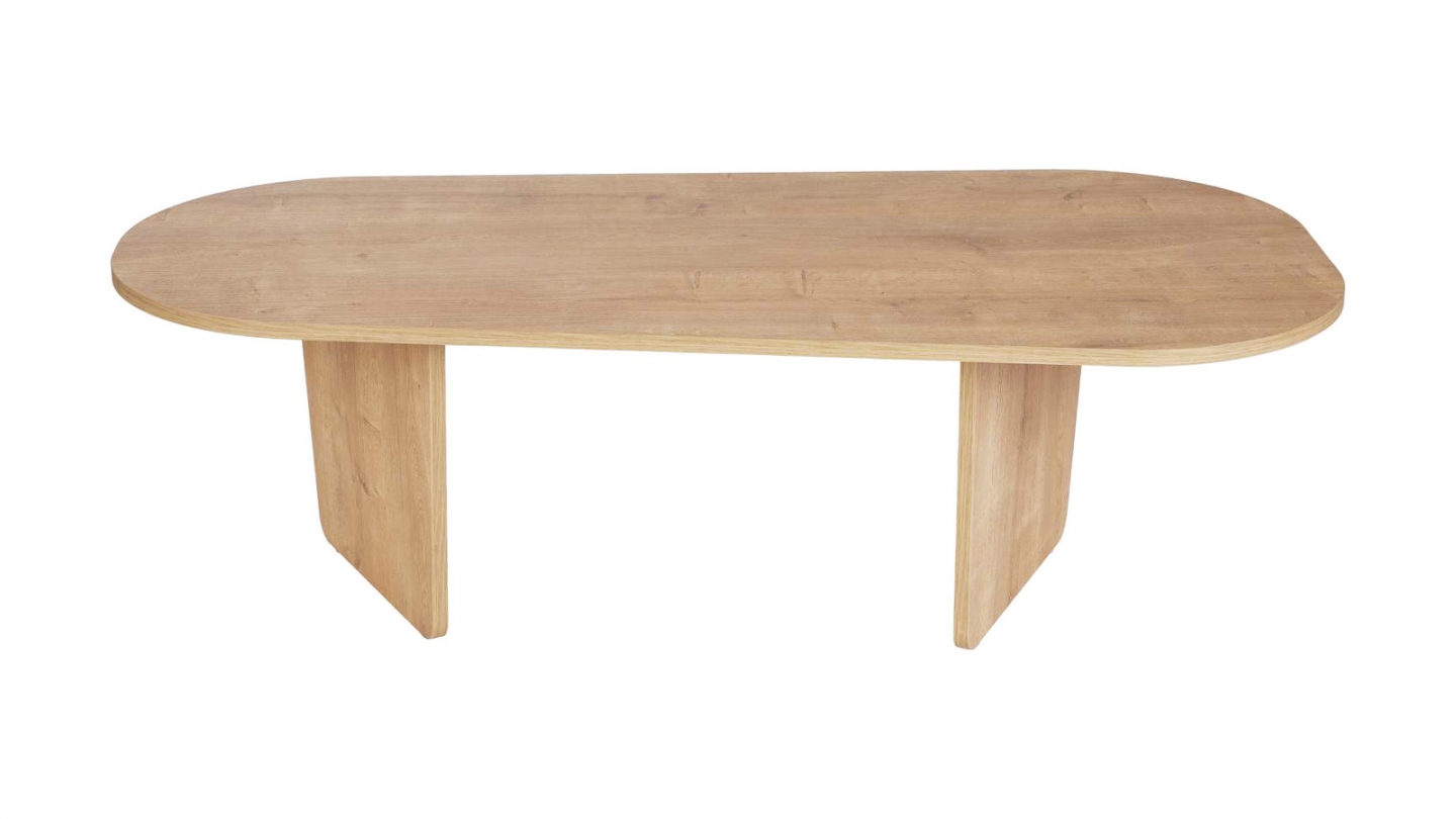 Table basse - Ceane• Matière : Mélamine• Couleur : Effet bois• Table basse de forme ovale asymétrique, soutenue par deux pieds pleins obliques pour un style moderne et harmonieux.• Dimensions totales : 130 x 65 x 40 cm