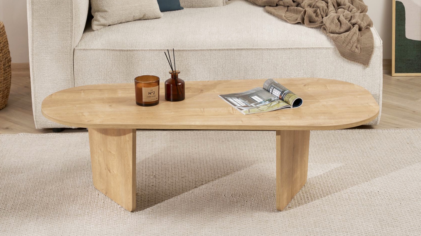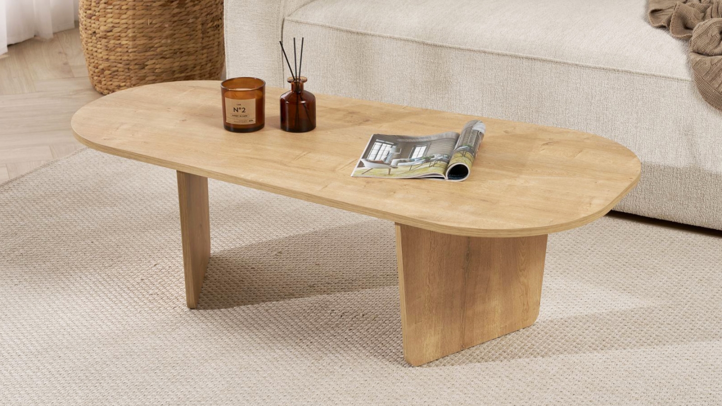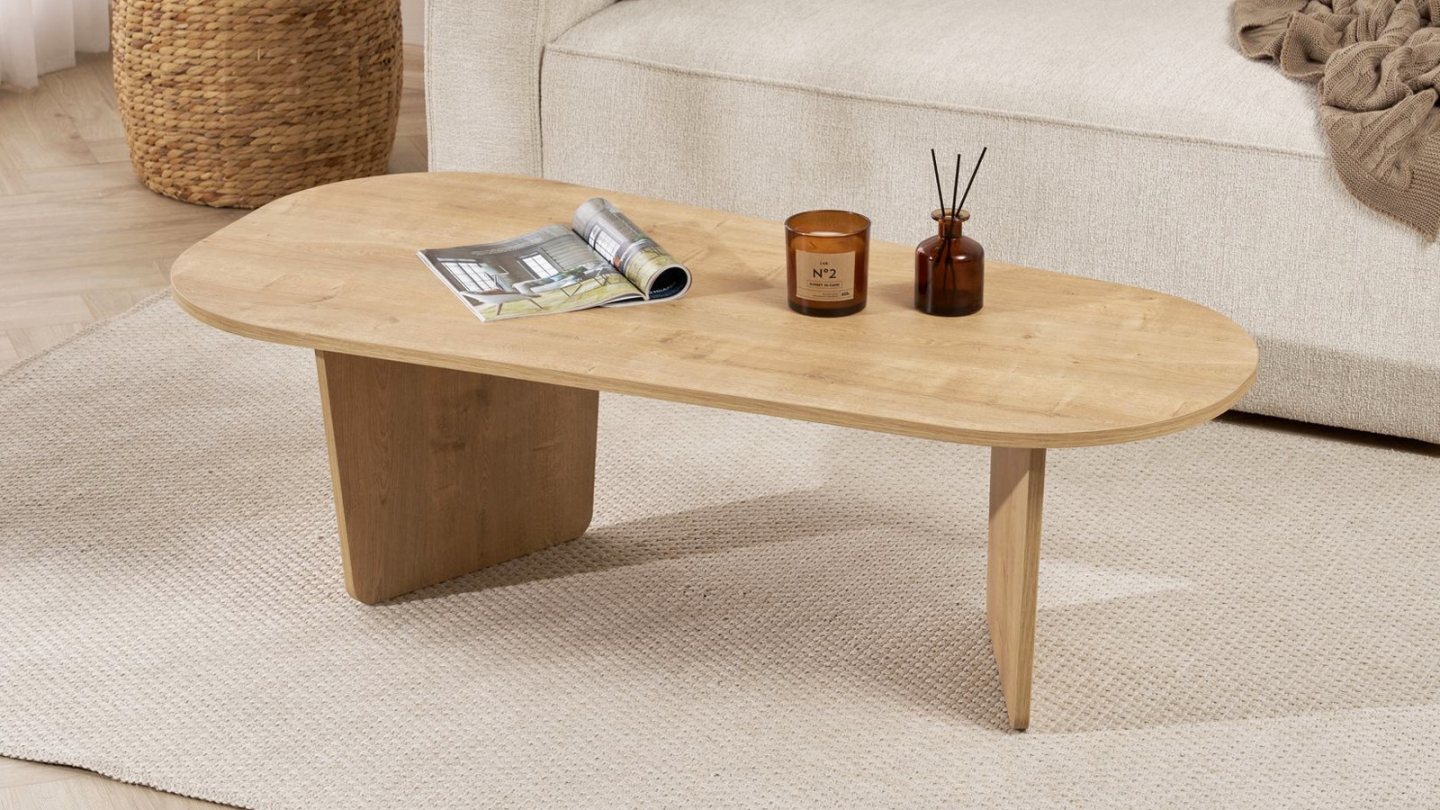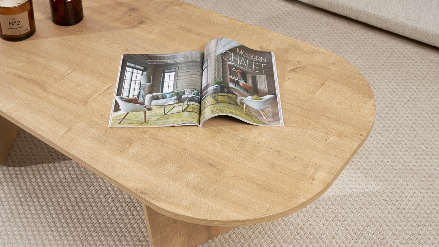 Table basse - Ceane• Matière : Mélamine• Couleur : Effet bois• Table basse de forme ovale asymétrique, soutenue par deux pieds pleins obliques pour un style moderne et harmonieux.• Dimensions totales : 130 x 65 x 40 cm