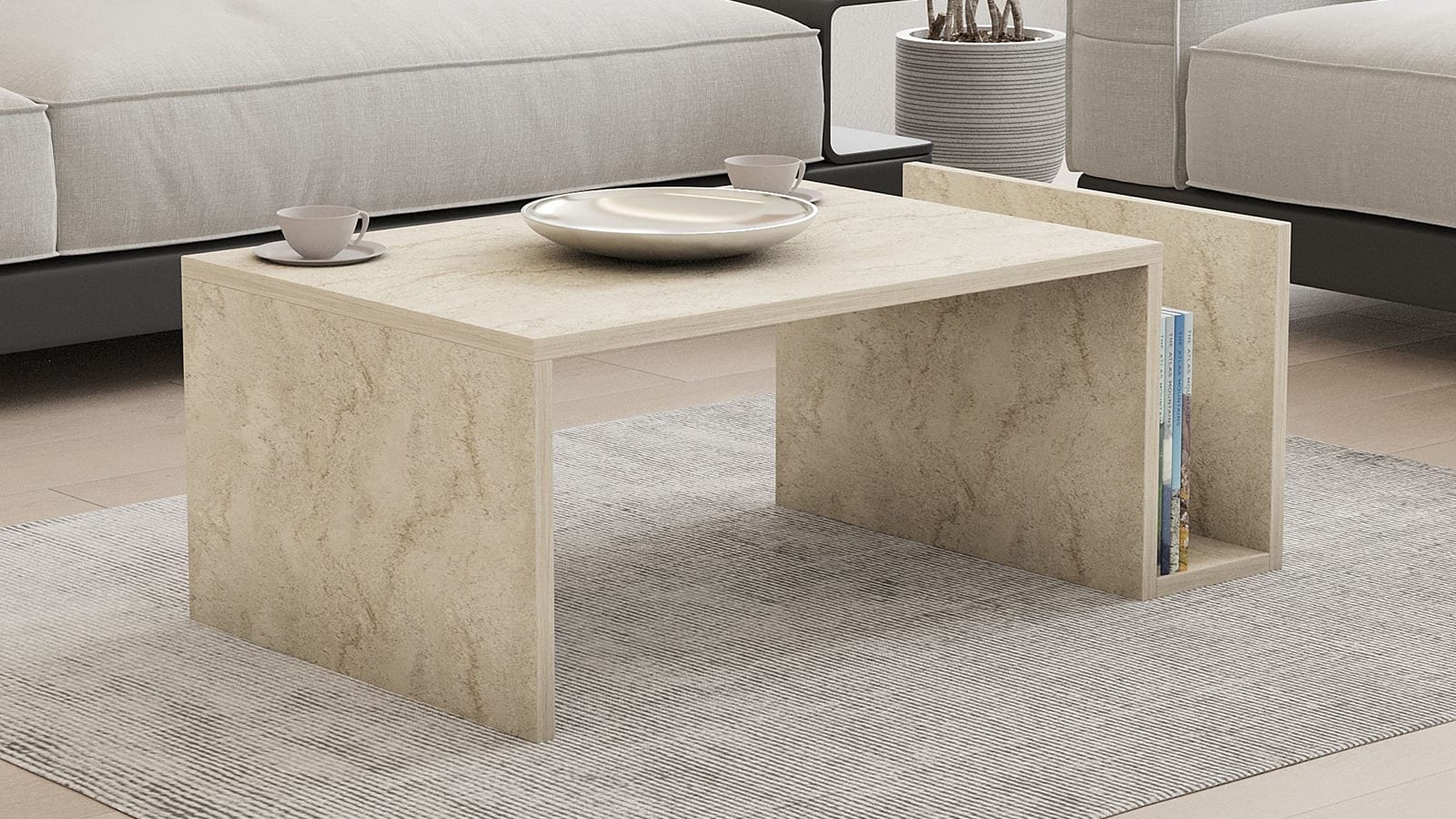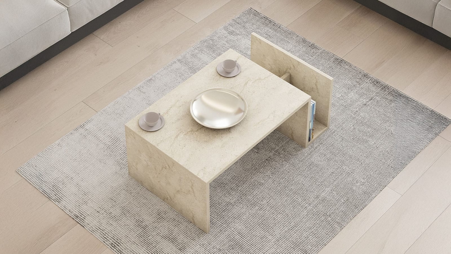 • Table basse effet pierre au design épuré, dotée d’un rangement latéral idéal pour garder livres et magazines à portée de main.