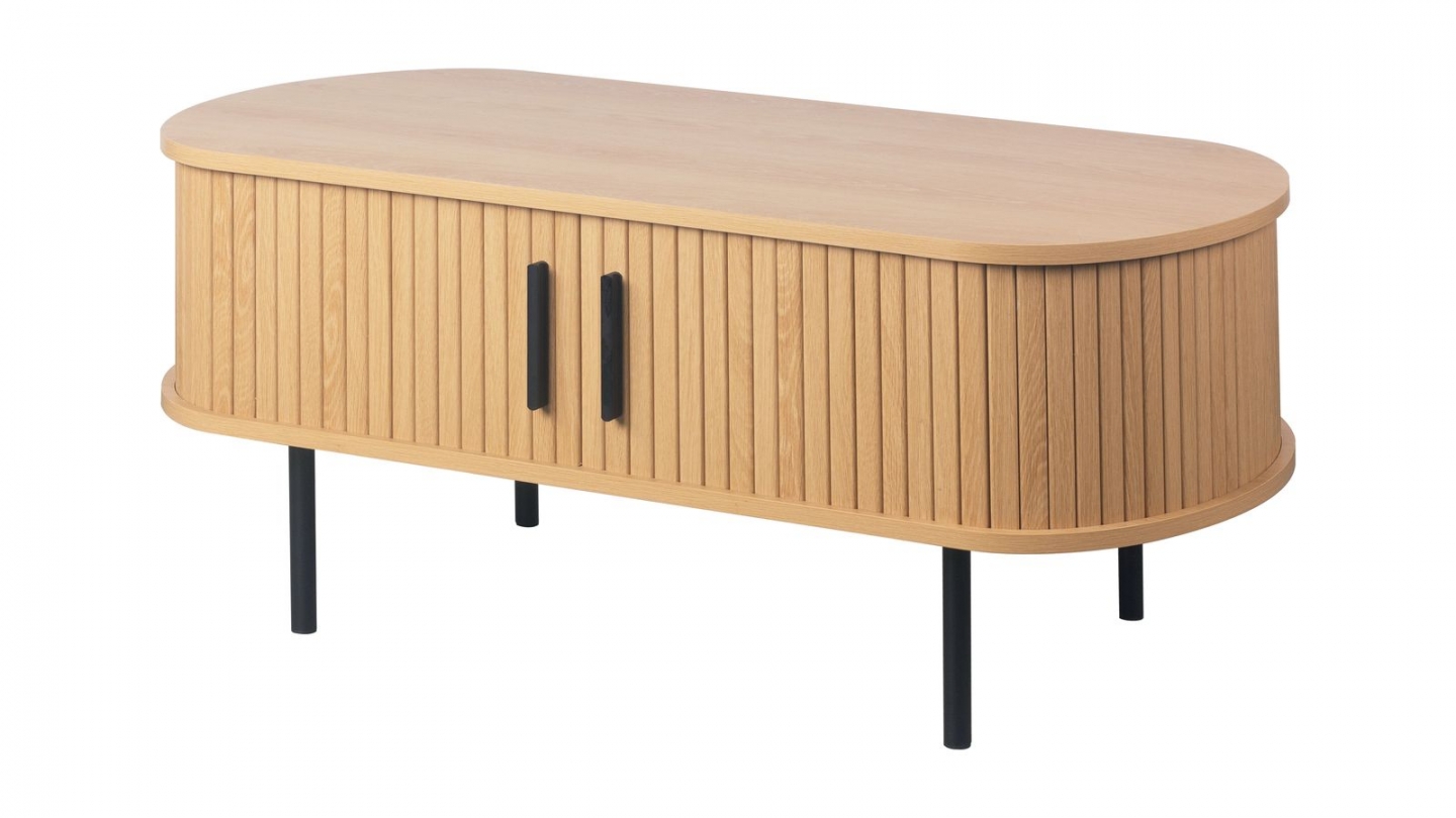 En stockMeuble TV 120 cm avec portes coulissantes - Sora • Matière : Mélamine • Couleur : Effet Chêne • Meuble aux coins arrondis. Finition lamelles effet Chêne • Piètement en Métal noir • Rangements : 2 niches, 2 portes avec espace de rangement • Dimensions totales : 120 x 40 x 45 cm • Avec passe câble