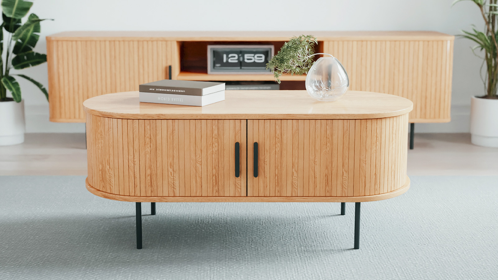 En stockBuffet - Sora• Matière : Mélamine• Couleur : Effet Chêne• Meuble au design arrondi. Finition lamelles effet Chêne• Piètement en Métal noir• Rangements : 2 portes avec espace de rangement• Dimensions totales : 120 x 40 x 80 cm