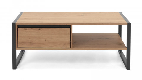 En stock• Table basse 1 porte 2 niches effet chêne, piétement anthracite 110,5 cm • Matières : Panneaux de particules • Couleur : Naturel effet chêne et piètement gris anthracite • 1 porte & 2 niches • Dimensions totales : 110,5x42x67 cm • Garantie 2 ans