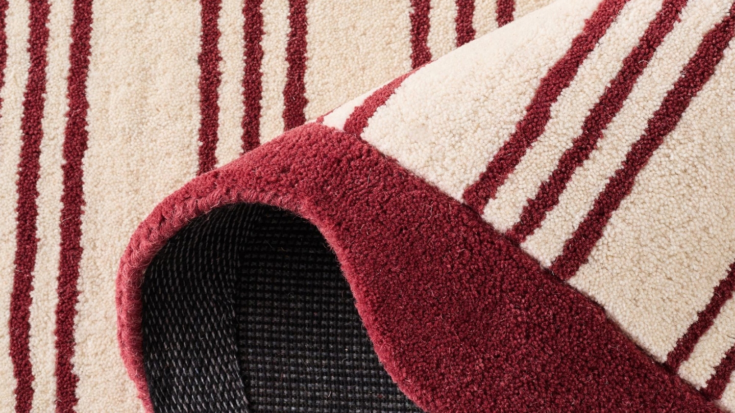 Rupture de stock• Tapis en laine motif géométrique rouge 133x190 cm– tissé main - Burgundy Stripes• Dimensions :133x190 cm• Couleur :Rouge• Matières : 100% laine et coton• Fait main - qualité premium - 100% laine & coton• Aspirateur et/ou chiffon humide